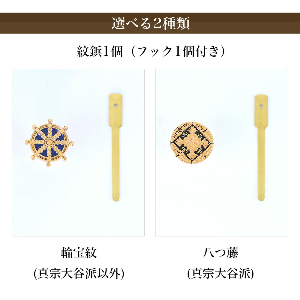 よく一緒に購入されている商品仏壇 神棚 をより荘厳に 1本 金メッキ 1,250円仏壇 座布団 御前座布団 No.69/座布団11,000円仏具6点+おりんセット 真鍮製仏具3寸 六具23,800円商品名 掛軸紋鋲(掛軸押さえ) サイズ (外寸) 直径17mm針長さ6mm掛軸をとめる場合に引っ掛けるところがない場合や、市販の画鋲(がびょう)で留めるのはちょっと味気ない。というご意見を元につくられた商品です。【宗派により異なります】※リストよりお選びください【八つ藤】浄土真宗大谷派(お東)【輪宝紋】浄土宗、日蓮宗、天台宗、真言宗、臨済宗、浄土真宗本願寺派(お西)、曹洞宗、禅宗、その他 内容 紋鋲1個・フック1個 送料 【メール便(ポストに投函)】での配送も可能です。 ポストに投函の為、日時指定は承りかねます。ご了承くださいませ。類似商品はこちら掛け軸用紋鋲3個セット or※3個販売です1,480円掛け軸用紋鋲2個セット or※2個販売です1,000円掛け軸 オリジナル掛軸 20代 30代 2,280円宗派紋木製1尺79,200円掛け軸 オリジナル掛軸 70代 阿弥陀如2,880円掛け軸 オリジナル掛軸 70代 曼荼羅o2,880円掛け軸 オリジナル掛軸 60代 曼荼羅o2,680円掛け軸 オリジナル掛軸 50代 阿弥陀如2,480円掛け軸 オリジナル掛軸 50代 曼荼羅o2,480円新着商品はこちら2025/11/5ペット用仏具 おりん 手元供養 テイロ 15,400円2025/10/28お位牌入れ さくら柄 桜 白木位牌 携帯用5,980円2025/10/23女性用高級念珠・数珠 本水晶 藤雲石仕立 銀花8,590円再販商品はこちら2025/11/19形見置き 手元供養 ハロクライントール 15,400円~2025/11/19形見置き 手元供養 ハロクラインワイド 16,500円~2025/11/19写真立て 手元供養 ピクスタル 仏具 国25,300円2025/11/22 更新