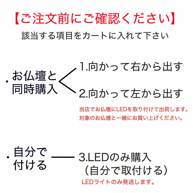 よく一緒に購入されている商品唐木仏壇 仏具セット 黒檀 or 紫檀 おし62,800円ミニ仏壇 ライト ダーク 掛軸 仏具セット 18,800円~唐木仏壇 黒檀 or 紫檀 唐木仏壇34,900円~類似商品はこちら仏壇用 LED電球お仏壇 電球色 仏壇 照明 2,250円仏壇用 LED電球電球色直径7.4cm 仏壇 2,500円仏壇 ワイン色 モダンミニ仏壇 仏壇29,800円お仏壇のダウンライト電球をLED電球に変更1,450円モダン仏壇 LEDライト 家具調仏壇 モダ89,800円ミニ仏壇 LEDライト モダンミニ仏壇39,800円ミニ仏壇 仏具セット LEDライト ウォールナ22,800円~モダンミニ仏壇 LEDライト 仏壇 モダン ミ49,800円ミニ仏壇 ダーク色・ライト色 14号 /家124,630円新着商品はこちら2025/11/5ペット用仏具 おりん 手元供養 テイロ 15,400円2025/10/28お位牌入れ さくら柄 桜 白木位牌 携帯用5,980円2025/10/23女性用高級念珠・数珠 本水晶 藤雲石仕立 銀花8,590円再販商品はこちら2025/12/1後飾り 高級 格子付き 祭壇 木製 3段 3029,800円2025/12/1唐木仏壇ニレ 家具調仏壇 仏壇 おしゃ67,300円2025/12/1仏壇 台 仏壇下台 仏壇置台 仏壇用黒塗り下72,800円2025/12/01 更新 商品について お仏壇にLEDライトを5,000円で設置できます。 仏壇と同時購入頂いた場合、当店で仏壇にLEDライトを設置して発送致しますが、LEDライト単品でのご購入の場合お客様自身で仏壇に取り付けをお願いします。 ・消費電力:3.5ワット(標準ACアダプター使用) ・ライトの色:電球色3500k(温かい色目のオレンジ色系です) ・LED寿命:約2万時間 ・明るさ:400ルクス ・コードの長さ:約2m70cm ・本体ライト部分の長さ:15cm その他 【保証期間】お買い上げから6カ月 【コードの位置について】 ※仏壇と同時購入のお客様のみ ・コードの位置を、お仏壇の【右側】【左側】からお選び下さい。お仏壇の仕様上、上部の右側or左側に開けます。・仏壇シルクのみ【後ろ側】にコードを出しますので、ご了承くださいませ。 【保証期間】お買い上げから6カ月(暗くなったり、点滅したり、消えてしまう場合は無料交換いたします) 【注意事項】※ご購入前にお読みください。 ※お仏壇にLEDライトを設置希望のお客様へ お仏壇にコード穴を加工をしますので、お客様都合でのご返品、ご交換は不可となります。 予めご了承くださいませ。 仏壇・位牌のなーむくまちゃん工房