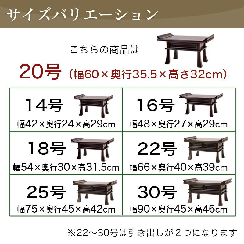 よく一緒に購入されている商品経机掛け20号 防炎マット2尺用仏壇 マット 4,180円経机掛け20号 防炎マット2尺用仏壇 マット 4,180円経机掛け20号 防炎マット2尺用仏壇 マット 4,180円・お仏壇の前に置く台(机)です。花立てや香炉、ローソク立て、線香立て、おりんなどを置いてお使い下さい。本来はお経の本を置く台である事から「経机」と呼ばれています。経机を使うと、座った状態でおまいりができ、線香やローソクなどの扱いも便利で安心してお使いいただけます。 ・経机と一緒に、安全とキズ防止の為に経机掛を一緒にお使いいただくとより安心です。 ・引出付きのシンプルなデザインですが、しっかりとした作りになっており重量感もあります。 類似商品はこちら経机 紫檀調・黒檀調・ケヤキ調 18号 幅5414,800円経机 紫檀調・黒檀調・ケヤキ調 16号 幅4812,800円経机 紫檀調・黒檀調・ケヤキ調 14号 幅4211,800円経机 紫檀調・黒檀調・ケヤキ調 22号 幅6622,800円経机 モダン経机 幅54.5cm 仏具 12,880円経机 紫檀調・黒檀調 25号 幅75cm 25,800円経机 モダン経机 幅60cm 仏具 仏壇13,480円紫檀・黒檀 総ムク材 22号 幅68cm 157,870円経机 紫檀調・黒檀調 30号 幅90cm 153,780円新着商品はこちら2025/11/5ペット用仏具 おりん 手元供養 テイロ 15,400円2025/10/28お位牌入れ さくら柄 桜 白木位牌 携帯用5,980円2025/10/23女性用高級念珠・数珠 本水晶 藤雲石仕立 銀花8,590円再販商品はこちら2025/12/1家具調仏具セット クリアAセット クリスタ24,000円2025/12/1モダン神棚 三社 壁掛け 札差 会社 3,280円2025/12/1後飾り 高級 格子付き 祭壇 木製 3段 3029,800円2025/12/01 更新 商品の特徴 お仏壇の前に置く台(机)です。 花立てや香炉、ローソク立て、線香立て、おりんなどを置いてお使い下さい。 本来はお経の本を置く台である事から「経机」と呼ばれています。 経机を使うと、座った状態でおまいりができ、線香やローソクなどの扱いも便利で安心してお使いいただけます。 経机と一緒に、安全とキズ防止の為に経机掛を一緒にお使いいただくとより安心です。 引出付きのシンプルなデザインですが、しっかりとした作りになっており重量感もあります。 宗派 全宗派対応 材質 木製: 紫檀調・黒檀調・ケヤキ調 重量 8.1kg サイズ ■14号:幅42cm×奥行24cm×高さ29cm(引出し1つ) ■16号:幅48cm×奥行27cm×高さ29cm(引出し1つ) ■18号:幅54cm×奥行30cm×高さ31.5cm(引出し1つ) ■20号:幅60cm×奥行35.5cm×高さ32cm(引出し1つ) ■22号:幅66cm×奥行40cm×高さ39cm(引出し2つ) ■25号:幅75cm×奥行45cm×高さ42cm(引出し2つ) ■30号:幅90cm×奥行45cm×高さ46cm(引出し2つ) ※手作り品ですので、寸法に多少の誤差がございます。 予めご了承くださいませ。 なーむくまちゃん工房 ▼経机掛けの同時購入はこちらから▼