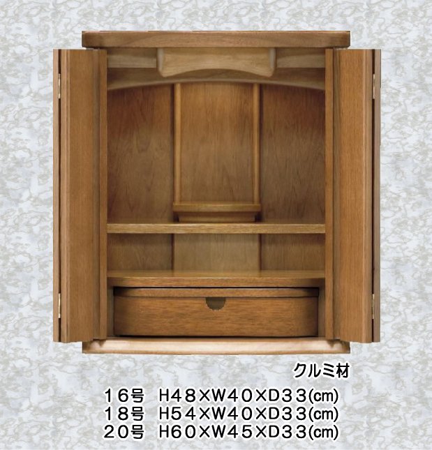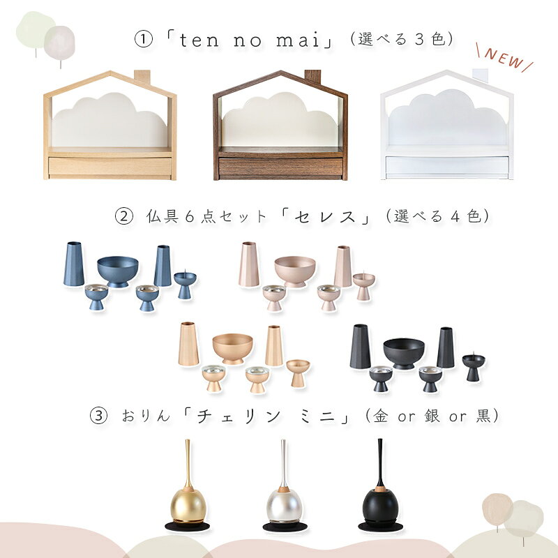 よく一緒に購入されている商品位牌 文字入れ 名入れ 送料無料 文字彫り ※1,500円~位牌 モダン 3.5寸・4.0寸・4.5寸 28,800円~唐木 モダン 位牌 4.0寸 (高さ15cm18,800円 特徴 当店オリジナルの北欧風ミニ仏壇に真鍮製の仏具とおりんをセットにしたお得な商品です。 ■北欧風ミニ仏壇「ten no mai」 温もり溢れるとんがり屋根にちょこんと乗ったかわいいエントツ、雲をイメージした白い背板。 可愛らしいおうち型のデザインがインテリアに自然と溶け込みます。 生活に馴染むようお部屋のトーンに合わせやすい3色をご用意しました。 ■真鍮製仏具6点セット「セレス」2.5寸 丸みと直線を潔く用いたモダンなデザインの仏具6点セット。 耐久性に優れ、水にも強く錆びにくい真鍮製です。 艶消し感のある高級塗装が施されており、全4色よりお選びいただけます。 ■日本製のおりん「チェリンミニ」 さくらんぼのような形が愛らしい本場高岡製のおりんです。 おりん本体にりん棒が付いているデザインでりん棒の先端部分には美しい音色を出す桜の木を採用しています。 本体は真鍮製で全3色よりお選びいただけます。 本体サイズ <外寸> 幅40cm×高さ33cm × 奥行15.5cm <内寸> 幅37cm×高さ22.5cm × 奥行15cm <ステージ> 幅37cm×高さ6.5cm × 奥行13cm <収納内寸> 幅33.5cm×高さ4cm × 奥行8cm 本体材質 表面材:天然木突板 主芯材:MDF(集成材) 本体重量 本体:約 2.4kg ステージ:約 1.3kg (総重量:約 3.7kg) セット内容 ・ミニ仏壇「ten no mai」 ・仏具6点セット「セレス」2.5寸 (花立て・香炉・ローソク立て・仏器・茶器・線香立て) ・おりん「チェリンミニ」 位牌 おすすめサイズ:総高さ15〜17cm前後 ご注意 ・本体とステージは分離しています。 持ち運ぶ際は一緒には持たず、別々に持ち上げてください。 ・生産時期により予告なく仕様変更される可能性がございます。 ・生産工程上避けられないものは全て仕様です。 バリエーション ・本体のみ ・セレスセット ・オリオンセット 類似商品はこちら仏壇 ミニ仏壇仏具セット レピア チェリンミニ34,800円仏壇 ミニ おうち型 モダンミニ仏壇 17,800円仏壇 ミニ おうち型 モダンミニ仏壇 24,800円北欧風 おうち型 ミニ仏壇仏具セット オリオン47,800円ミニ仏壇仏具セット このはな モダンミニ16,480円オープン 仏壇 ステージ ドーム型 モ49,800円ミニ仏壇 選べる仏具セット モダン ミニ5,980円~ミニ仏壇 仏具セット 白 金蓮 or 青磁 11,800円ミニ仏壇本体のみ モダンミニ仏壇 仏壇 6,980円新着商品はこちら2025/11/5ペット用仏具 おりん 手元供養 テイロ 15,400円2025/10/28お位牌入れ さくら柄 桜 白木位牌 携帯用5,980円2025/10/23女性用高級念珠・数珠 本水晶 藤雲石仕立 銀花8,590円再販商品はこちら2025/11/23遠山三宝 7寸 神棚 神具 鏡餅 御供 祭壇2,950円2025/11/19形見置き 手元供養 ハロクライントール 15,400円~2025/11/19形見置き 手元供養 ハロクラインワイド 16,500円~2025/11/23 更新 特 徴 当店オリジナルの北欧風ミニ仏壇に真鍮製の仏具とおりんをセットにしたお得な商品です。 ■北欧風ミニ仏壇「ten no mai」 温もり溢れるとんがり屋根にちょこんと乗ったかわいいエントツ、雲をイメージした白い背板。 可愛らしいおうち型のデザインがインテリアに自然と溶け込みます。 生活に馴染むようお部屋のトーンに合わせやすい3色をご用意しました。 ■真鍮製仏具6点セット「セレス」2.5寸 丸みと直線を潔く用いたモダンなデザインの仏具6点セット。 耐久性に優れ、水にも強く錆びにくい真鍮製です。 艶消し感のある高級塗装が施されており、全4色よりお選びいただけます。 ■日本製のおりん「チェリンミニ」 さくらんぼのような形が愛らしい本場高岡製のおりんです。 おりん本体にりん棒が付いているデザインでりん棒の先端部分には美しい音色を出す桜の木を採用しています。 本体は真鍮製で全3色よりお選びいただけます。 本体サイズ <外寸> 幅40cm×高さ33cm × 奥行15.5cm <内寸> 幅37cm×高さ22.5cm × 奥行15cm <ステージ> 幅37cm×高さ6.5cm × 奥行13cm <収納内寸> 幅33.5cm×高さ4cm × 奥行8cm 本体材質 表面材:天然木突板 主芯材:MDF(集成材) 本体重量 本体:約 2.4kg ステージ:約 1.3kg (総重量:約 3.7kg) セット内容 ・ミニ仏壇「ten no mai」 ・仏具6点セット「セレス」2.5寸 (香炉・ローソク立て・茶器・仏器・花立て) ・おりん「チェリンミニ」 位牌 おすすめサイズ:総高さ15〜17cm前後 ご注意 ・本体とステージは分離しています。 持ち運ぶ際は一緒には持たず、別々に持ち上げてください。 ・生産時期により予告なく仕様変更される可能性がございます。 ・生産工程上避けられないものは全て仕様です。 セットバリエーション ・本体のみ ・セレスセット ・オリオンセット