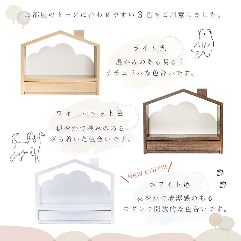 よく一緒に購入されている商品ペット仏具 陶器8点セット 5具足 仏具セッ3,880円チェリン ミニ 金色 銀色 黒色 ゴールド シ8,280円 特徴 当店オリジナルの北欧風おうち型ペット仏壇です。 普段の生活に馴染みやすい3色をご用意しました。 温もり溢れるとんがり屋根にちょこんと乗ったかわいいエントツ、雲をイメージした白い背板。 大好きだったおやつをあげたり、お花やおもちゃを飾ったり。 大切なあの子とこれからもずっと一緒に居られるように、あの子のための「新しいおうち」をすぐそばに。 カラー ライト色 / ウォールナット色 / ホワイト色 サイズ <外寸> 幅40cm×高さ33cm × 奥行15.5cm <内寸> 幅37cm×高さ22.5cm × 奥行15cm <ステージ> 幅37cm×高さ6.5cm × 奥行13cm <収納内寸> 幅33.5cm×高さ4cm × 奥行8cm 材質 表面材:天然木突板 主芯材:MDF(集成材) 重量 本体:約 2.4kg ステージ:約 1.3kg (総重量:約 3.7kg) 位牌 おすすめサイズ:総高さ15〜17cm前後 ご注意 ・本体とステージは分離しています。 持ち運ぶ際は一緒には持たず、別々に持ち上げてください。 ・生産時期により予告なく仕様変更される可能性がございます。 ・生産工程上避けられないものは全て仕様です。 おすすめ仏具 ・おうちシリーズ 類似商品はこちらペット仏壇仏具セット おしゃれ コンパクト14,800円~仏壇 ミニ仏壇仏具セット セレス チェリンミニ42,800円仏壇 ミニ仏壇仏具セット レピア チェリンミニ31,800円北欧風 おうち型 ミニ仏壇仏具セット オリオン47,800円ペット用仏壇 家具調仏壇 モダン仏壇 ミニ仏壇18,800円仏壇 ミニ おうち型 モダンミニ仏壇 14,800円仏壇 ミニ おうち型 モダンミニ仏壇 24,800円ミニ仏壇 選べる仏具セット モダン ミニ5,980円~唐木仏壇 仏具セット 黒檀 or 紫檀 おし48,800円新着商品はこちら2025/12/18あしあとペット仏具 5点セット 5具足 仏具4,400円2025/12/18ペット仏具 おそらの花おりん 真鍮製 ちり3,300円2025/11/5ペット用仏具 おりん 手元供養 テイロ 15,400円再販商品はこちら2025/12/23ミニ仏壇 家具調仏壇 モダン仏壇 小型仏壇 42,800円2025/12/23仏壇仏具セット モダンミニ仏壇 ミニ仏壇セッ68,800円2025/12/23モダン神棚 ヒノキ Neo510W 国産66,800円2025/12/24 更新 天の舞にプティサイズが新登場! 雲の背板やエントツはそのままにステージがなくなってより 可愛くコンパクト に! >> 今すぐチェック 特 徴 当店オリジナルの北欧風おうち型ペット仏壇です。 普段の生活に馴染みやすい3色をご用意しました。 温もり溢れるとんがり屋根にちょこんと乗ったかわいいエントツ、雲をイメージした白い背板。 大好きだったおやつをあげたり、お花やおもちゃを飾ったり。 大切なあの子とこれからもずっと一緒に居られるように、あの子のための「新しいおうち」をすぐそばに。 カラー ライト色/ウォールナット色 / ホワイト色 サイズ <外寸> 幅40cm×高さ33cm × 奥行15.5cm <内寸> 幅37cm×高さ22.5cm × 奥行15cm <ステージ> 幅37cm×高さ6.5cm × 奥行13cm <収納内寸> 幅33.5cm×高さ4cm × 奥行8cm 材 質 表面材:天然木突板 主芯材:MDF(集成材) 重 量 本体:約 2.4kg ステージ:約 1.3kg (総重量:約 3.7kg) 位 牌 おすすめサイズ:総高さ15〜17cm前後 ご注意 ・本体とステージは分離しています。 持ち運ぶ際は一緒には持たず、別々に持ち上げてください。 ・生産時期により予告なく仕様変更される可能性がございます。 ・生産工程上避けられないものは全て仕様です。 おすすめ仏具 ・おうちシリーズ