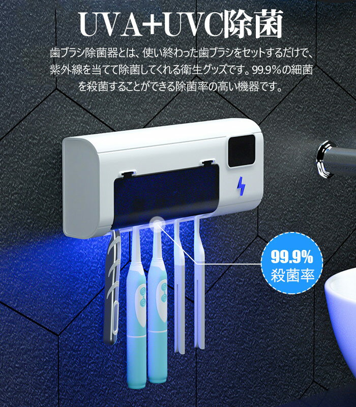歯ブラシ除菌器 UVA+UVC 除菌 紫外線 充電式 歯ブラシスタンド 壁掛け 歯ブラシホルダー 壁掛け用 自動除菌 乾燥 便利な時計機能 歯ブラシホルダー ケース 歯ブラシ除菌機 穴あけ不要
