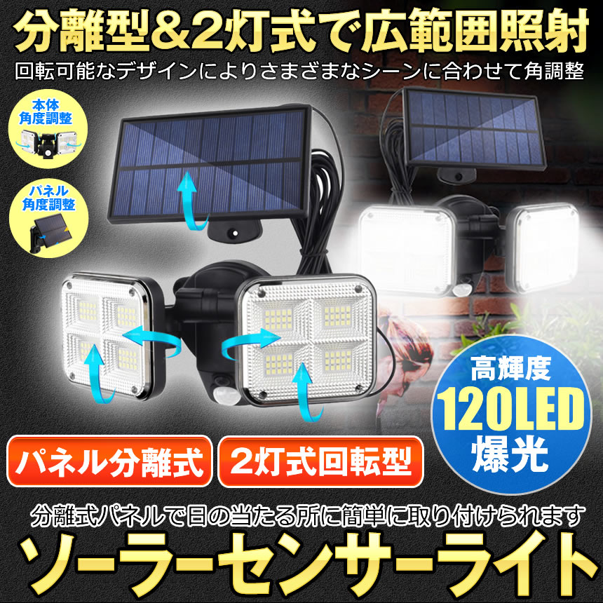 【パネル分離型】 ソーラーライト 屋外 防水 センサーライト ソーラー パネル 分離型 ソーラーセンサーライト 人感センサーライト 2灯式 5Mコード 防犯ライト 防災ライト 壁掛け式 120LED 屋外照明 玄関 駐車場 庭 防災 防雨タイプ 玄関 駐車場