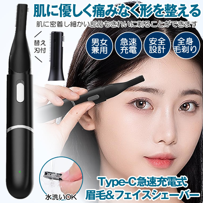 【 急速 充電式 TYPE-C 】 眉毛シェーバー フェイスシェーバー 眉毛 シェーバー メンズ レディース 女性 顔 替え刃 付き 眉毛カッター 顔そり 電動 産毛 フェイス用 眉毛剃り 全身適用 肌に優しい マユコーム付き 替刃式 水洗い可能 コンパクト プレゼント 父の日