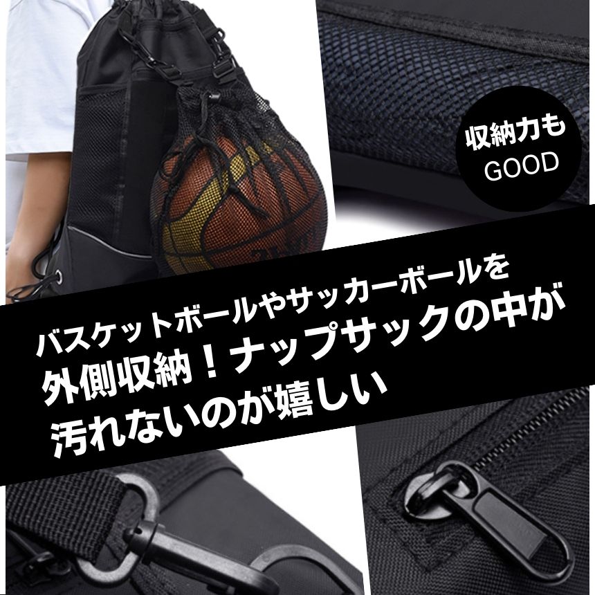 【ボール外側収納】バッグ下のポケットからメッシュバッグを取り出せばバスケットボールも保管可能。サッカーボール、バレーボール、ランニングシューズ、ヘルメットなどが収納できます。【収納力抜群】タブレットやA4サイズのファイルが余裕で入るなサイズ。ジムの着替えやスポーツ用品などの持ち運びにも便利。両サイドもポケットあり、傘や水筒を分けて持ち運びに便利です。【引き紐仕様・防水性】このスポーツバッグは縄を引く設計で、開けても閉めてもとても便利です。バッグの表面は防水コーティングされている,小雨程度などは問題ありません。【幅広い用途】サッカー、ジム、水泳、キャンプ、部活、登山、旅行など様々な場面で大活躍です。外側収納!ナップサックの中が汚れないのが嬉しい 送料無料※北海道は+330円UP、離島地域及び沖縄県は+950円UPにて承ります。