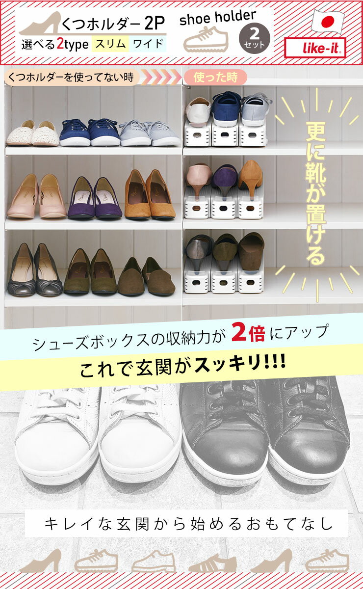 靴 ホルダー [くつホルダー2P(スリム・ワイド)] シューズホルダー 2足分 日本製 下駄箱 整理整頓 引き出し穴 片手で引き出せる 通気性 [ライクイット] 靴にあった幅が選べる 靴収納 スリム ワイド SHS-01 SHW-01 白 完成品 【ポイント2倍】【e暮らしR】