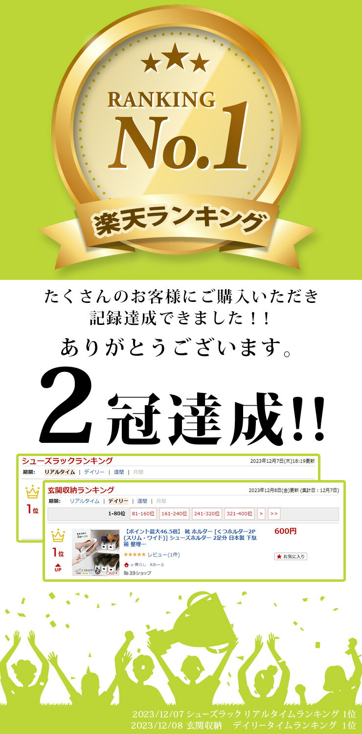 くつホルダー2P(スリム・ワイド) /ライクイット 仕様 サイズ(1個あたり):[スリム]約幅8×奥行26×高さ13.5cm、[ワイド]約幅10×奥行26×高さ13.5cm 重 量(1個あたり):[スリム]約128g、[ワイド]約161g 材質:[本体]ポリプロピレン、[ストッパー]EVA樹脂 原産国:日本 完成品(ストッパーのみ取付けてください。) ※WEB上のため、実物と画像とで色など、多少違う点がございますのでご理解ください。 ※商品仕様・サイズ・パッケージ等は変更する場合があります。 ※ご注文日より通常5営業日以内に発送(土日祝日を除く)となります。 商品の特長 くつホルダー2P 靴が滑り落ちないように凸凹加工、ストッパー付き 片手でサッと引き出せるように便利な引き出し穴付き 安心の日本製 お手持ちの靴に合わせて幅が選べます。(スリム・ワイド) ライクイット くつホルダー2P(スリム・ワイド) like-it Perfect Organizer shoe holder 靴 収納 靴ホルダー 靴箱整理 シューズホルダー シューホルダー シューキーパー 日本製 2セット 2足分 省スペース 半分のスペースに置ける スッキリ 効率よい収納 効率的 下駄箱 整理整頓 収納グッズ 玄関収納 収納力アップ 通気性 取り出しやすい 片手で引き出せる 引き出し穴 2タイプの幅 靴にあった幅が選べる 2サイズ 見栄え良い 滑り止め 凸凹加工 背板付き 背板付きで靴が安定 上下に収納 片足分に1足収納 型崩れしにくい 綺麗な玄関 収納量倍増 ストッパー付き 靴が滑り落ちない スペース有効活用 使わない時は重ねる スタッキング くつ クツ スニーカー パンプス 革靴 ハイヒール シューズ シューズボックス シューズラック 靴箱 玄関 くつ箱 1人暮らし ひとり暮らし 一人暮らし 二人暮らし 新生活 新居 新築 大掃除 引っ越し 贈り物 誕生日 プチプレゼント 便利 役立つ おすすめ オススメ 人気 ナチュラル クラシカル シンプル おしゃれ オシャレ お洒落 北欧 スリム ワイド SHS-01 SHW-01 ホワイト 白 完成品 楽天リアルタイムランキング1位獲得[シューズラック部門] 楽天デイリーランキング1位獲得[玄関収納部門] 季節の贈り物に 父の日 母の日 敬老の日 孫の日 御中元 敬老の日 ハロウイン クリスマス 冬ギフト お歳暮 お年賀 お正月 年末年始 バレンタイン ホワイトデー 日々の心づかい、ちょっとした手みやげに 御祝 御礼 御挨拶 粗品 お使い物 贈答品 ギフト プレゼント お土産 手土産 贈りもの 進物 お返し お祝いや内祝いなど祝儀の品に 引き出物 お祝い 内祝い 結婚祝い 出産祝い 引き菓子 快気祝い プチギフト お誕生日 七五三 進学内祝 入学内祝片足分のスペースに収納できるから、シューズボックスの収納量2倍を実現。 靴の内側に差し込まないので、サンダルやミュールなどにも使えます。 靴の内側に差し込まず、付属のストッパーで、靴を支えます。 靴が滑り落ちない凸凹加工。抜群の安定性があります。 スタッフの独り言 某●円ショップで購入したものは、靴の内側に差し込むタイプで フラフラ感と取り出しにくさがありました。 その点、このくつホルダーは靴が安定されていて 引出し穴を使えば、片手でサッと取り出せます。 これが超おすすめポイントです。 ライクイットの商品はこちら