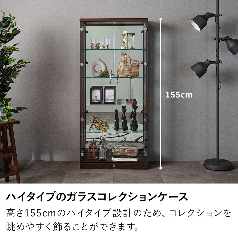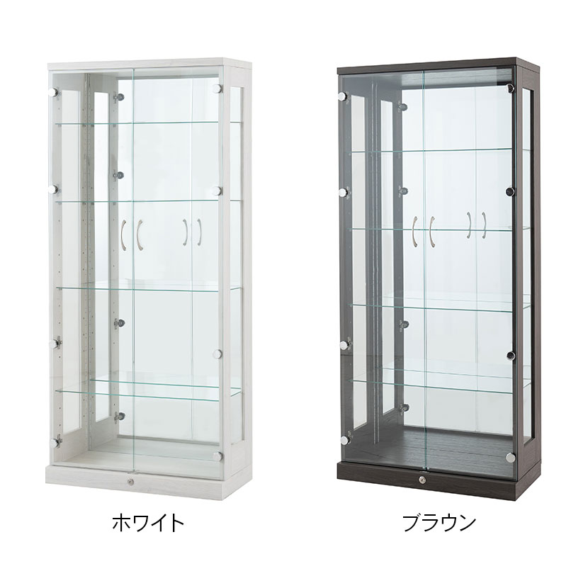 カカオ 70コレクションH155 美しく、眺めやすく飾ることができるガラスコレクションケース。縦型のLEDライトが付いており、コレクションを鮮やかに照らします。●コレクションを引き立てるLEDライト付き両サイドの側面に、縦型のLEDライトが付いています。コレクションを美しく照らし、消灯時とは違った雰囲気を楽しめます。●様々な角度から眺められるガラス張り仕様正面だけでなく、左右側面もガラス張り仕様のため、横からもコレクションを眺めることが可能です。光も多く差し込み、内部を明るく彩ります。●後ろ側を映す背面ミラー仕様ケース内側の背面全体がミラー仕様になっています。コレクションがミラーに映るため、収納したまま後ろ側まで眺めることが可能です。●便利な可動ガラス棚扉内のガラス棚は全段便利な可動式です。棚の高さ調節ができるため、飾るものに合わせて柔軟に対応できます。●大切なコレクションを守る鍵付き台輪部分には鍵が付いており、コレクションを大切に保管できます。(スペアキー合わせて2個標準装備) 商品について サイズ(本体)幅700×奥行320×高さ1550mm サイズ(内寸)幅660×奥行250×高さ1460mm サイズ(その他)可動棚 / 幅657×奥行246mm 材質MDF3Dコート紙貼り扉 / 強化ガラス 梱包数1 梱包サイズ幅750×奥行360×高さ1610mm 梱包重量52kg 組み立て現地組立品 ※お客様組み立て不要(現地にて業者が組み立て作業を行います) 付属品鍵(2個) 備考LEDライト付き可動ガラス棚 / 4枚付き(12段階・62mmピッチ) 配送について お届け日についてお届け日確認のため、配送会社よりお電話またはショートメールにてご連絡いたします。※配送地域によっては曜日が限定される場合がございます。 お届け時間について時間指定(午前・午後を含む)を承ることはできません。お届け時間は、お届け日当日午前中までに改めて配送会社よりご連絡いたします。 配送費用について配送設置無料※北海道は1個あたり別途送料5500円(税込)※沖縄・離島は別途送料お見積り 階上げについてエレベーターがない場合、もしくはエレベーターに商品が入らない場合は、2階まで無料。3階以上は1商品毎につき2200円(税込)頂戴いたします。 吊り上げについて搬入先条件によっては、吊り上げも対応しております。※吊り上げをご希望の場合は、現地確認費用、吊り上げ費用を頂戴いたします。※現地確認費用5500円(税込)、吊り上げ費用(別途お見積り) 組み立て・設置付きについてこちらの商品は組立設置付きでのお届けとなります。 再配送について配送時のお客様不在による持ち帰りが発生した場合、別途配達費用、商品保管費用を頂戴いたします。※手数料11000円(税込) ご注意大型商品のため、梱包サイズ、搬入経路のご確認をお願いいたします。 注意点:モニターの発色具合により色合いが異なる場合がございます。 お届けについて ※ご購入前に必ずご確認ください