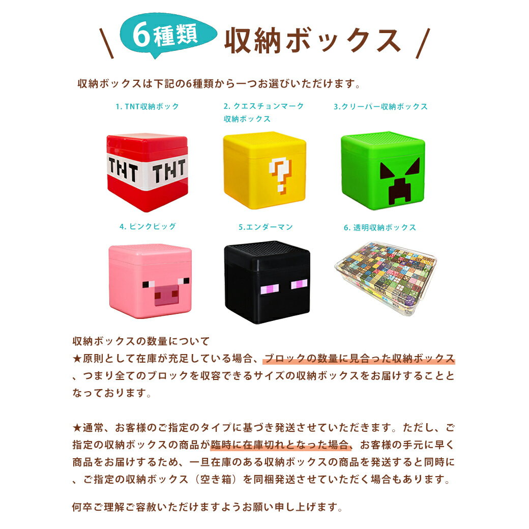 商品説明商品:磁石ブロック 素材:ABS 対象年齢:6歳以上 ※当商品はレゴ(LEGO)商品ではございません。収納ボックスの種類について収納ボックスは下記の6種類から一つお選びいただけます。 実際のお届けは、お選び頂いたオプション内容に基づいて行われます。 1. TNT収納ボックス 2. クエスチョンマーク収納ボックス 3. クリーパー収納ボックス 4. ピンクピッグ 5. エンダーマン 6. 透明収納ボックス 収納ボックスのお選び方法について ★6種類の収納ボックスから一つお選びください。 ★複数種類お選びいただいた場合は、こちらでランダムにて発送させていただきます。予めご了承ください。収納ボックスの数量について原則として在庫が充足している場合、ブロックの数量に見合った収納ケース、つまり全てのブロックを収容できるサイズの収納ボックスをお届けすることとなっております。 通常、お客様のご指定のタイプに基づき発送させていただきます。ただし、ご指定の収納ボックスの商品が臨時に在庫切れとなった場合、お客様の手元に早く商品をお届けするため、一旦在庫のある収納ボックスの商品を発送すると同時に、ご指定の収納ボックス(空き箱)を同梱発送させていただく場合もあります。 何卒ご理解ご容赦いただけますようお願い申し上げます。特徴未組立品で、組み立ても楽しく、パーツが外れるので、色々な組み合わせでも遊べます。 子供でも大人がびっくりするくらい強い力を持っています。子供から大人まで楽しめて遊びましょう! お子様やお孫様へのプレゼントに、クリスマスやお誕生日、入園卒園進学のお祝いなどのプレゼントにお勧めです。 指先の動きが急速に進歩する時なので、指先をたくさん使って遊んでください。観察力が出てきて、ごっこあそびが楽しくなります。 高品質のABS樹脂で作られ安全で無毒、無臭、耐久性にも優れているのでお子様が安全にご使用できます。 集中力・論理的思考・構成力。遊びながら考える力を育てるブロックです! 物をしっかりとつかむことにまだ慣れていない小さな手にとって、適度な重量感は、指先や手の訓練に役立ちます。注意事項※商品のバージョンアップによって、実物に多少表現が異なる可能性があります。予めご了承ください。 ※小さなブロックが多く含まれています。誤って飲み込まないようご注意ください。 ※PC環境や光の具合により、色や素材のイメージが写真と若干異なる場合がございます。 ※計測は手動によるものですので、若干の誤差が生じる場合がございます。ご了承ください。関連キーワードミニフィグ 互換 ミニフィギュア ブロック おもちゃ キッズ 子ども おもちゃ 子供 男の子 女の子 大人気 交換品 誕生日 入園プレゼント おもちゃ 子供 知育玩具 知育おもちゃ 子供シリーズ おもちゃ 女の子 男の子 ベビー 赤ちゃん 子供会 景品 お祭り 縁日 安全 運動能力 創造 知恵 遊び 想像力 創造力 子供用 内祝い 子ども オモチャ クリスマス 誕生日プレゼント 安心 高品質 誕生日 プレゼント 贈り物 オシャレ オススメ おしゃれ ポイント オリジナル デザイン かわいい かっこいい 玩具 収納 おもちゃ 知育玩具 安全 人気 知育 オモチャ 子供 キッズ 軽量 こども 誕生日 プレゼント ギフト 七五三 こどもの日 祝い クリスマス プレゼント クリスマス ギフト 積み木 子供 知育 小学生 中学校 高校生 入学 入園 卒園 就学祝い DIY 想像力 楽しい 組み立て おうち遊び お家遊び 送料無料