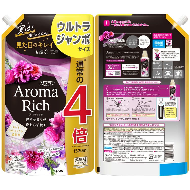 【6個セット】ソフラン プレミアム消臭 アロマリッチ 柔軟剤 1520ml 詰め替え用 ライオン ウルトラジャンボ(通常の4倍) 柔軟仕上げ剤 香る ファブリックソフナー 消臭 詰替 アロマ製法 劇的抗菌 1.52L 大容量