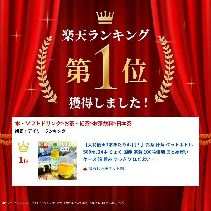 アイリスのお茶“緑(りょく)”。・低温密閉抽出・国産茶葉100%使用【低温密閉抽出で、香りも旨みも引き立つ】低温でじっくり丁寧に抽出。渋み・苦みを抑え、甘みを引き立たせた、すっきりとごくごく飲めるおいしさでです。●品名緑茶(清涼飲料水)●原材料名緑茶(国産)/ビタミンC●内容量500ml×24本●栄養成分表示(100mlあたり)エネルギー:0kcalたんぱく質、脂質、炭水化物:0g食塩相当量:0.03g●保存方法高温・直射日光を避けて保存してください●原産国日本○広告文責:e-net shop株式会社(03-6706-4521)○メーカー(販売/製造):アイリスフーズ株式会社/アイリスオーヤマ株式会社○区分:一般食品(飲料)(検索用:お茶 緑茶 ペットボトル 500ml 24本 国産 茶葉 100%使用 まとめ買い ケース 箱 旨み すっきり ほどよい 甘み 飲みやすい 食事 低温密閉抽出 香り華やか 朝 スッキリ 日本茶 緑 4562403571106)最強翌日配送対象商品に関するご案内 最強翌日配送対象商品・対象地域に該当する場合は最強翌日配送マークがご注文カゴ近くに表示されます。 最強翌日配送可能なお支払方法は【クレジットカード、代金引換、全額ポイント支払い】のみとなります。 下記の場合は最強翌日配送対象外となります。 ・15点以上ご購入いただいた場合 ・時間指定がある場合 ・ご注文時備考欄にご記入がある場合 ・決済処理にお時間を頂戴する場合 ・郵便番号や住所に誤りがある場合 ・最強翌日配送対象外の商品とご一緒にご注文いただいた場合 ・お届け先住所文字数が40文字以上の場合 関連キーワード(本商品の説明ではありません)母の日 父の日 敬老の日 こどもの日 クリスマス バレンタイン ホワイトデー ハロウィン お正月 成人の日 成人式 記念日 誕生日 卒業式 入学式 お歳暮 お中元 春 夏 秋 冬 梅雨 節分 ひな祭り 七夕 十五夜 初詣 年越し 夏祭り 花火大会 結婚祝い 内祝い 出産祝い 快気祝い 還暦祝い 古希 喜寿 傘寿 米寿 卒寿 白寿 百寿 新築祝い 引っ越し祝い 開店祝い 開業祝い 就職祝い 昇進祝い 合格祝い 銀婚式 金婚式 七五三 長寿祝い 御礼 お母さん お父さん 義母 義父 祖父 祖母 おばあちゃん おじいちゃん 娘 息子 彼氏 彼女 恋人 友達 上司 先輩 後輩 同僚 キッズ 子供 幼児 ベビー 赤ちゃん 育児 学生 社会人 シニア 10代 20代 30代 40代 50代 60代 70代 80代 90代 一人暮らし 単身赴任 主婦 主夫 新生活 家族暮らし 子育て 旅行 トラベル ライブ ホームパーティ ビジネス 法人 ギフト プレゼントこの商品を見ている人は▼こちらもチェック▼ ランキング1位!富士山の天然水 ミネラルを手軽に♪シリカ炭酸水 お惣菜セットも!パックご飯40食 レビュー★5獲得!お茶2L×6本 ★☆★当店イチ押しアイテム!★☆★