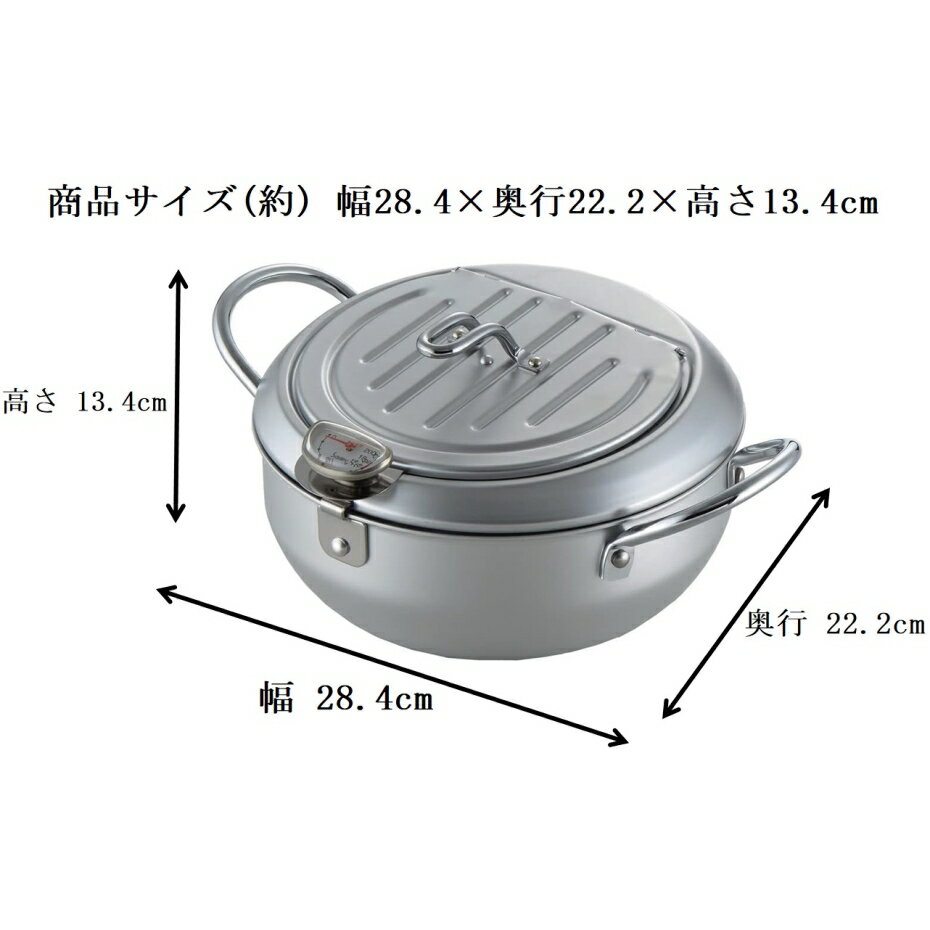 商品情報商品説明●「油切り」・「油はね防止」・「温度計」付で、揚げ物上手に!●バッドが要らない、油切りフタが付いています。●油切りフタに傾斜がついている為、余分な油が鍋へ戻るのでヘルシーになります。●鍋の周囲を、油はねガードで囲んでいる為、油はねを防止します。●温度計付きで、油の温度を保ちやすく揚げ頃を逃しません。●安定感抜群のストッパー付きで、フタに天ぷらをのせても、ひっくり返りません。●両手ハンドル付きで、油の移し替えが簡単です。●フタは分解できるため、片付けも簡単です。※温度計は水洗いできません。●鍋表面にサビ防止のシリコン焼付塗装を施している為、長くご使用できます。●燕三条の職人の手によって大切に作られている、安心安全の日本製です。商品規格■商品サイズ(約) 幅28.4×奥行22.2×高さ13.4cm (鍋高 8cm)■満水容量 2.2L■商品重量 1.32kg■対応熱源 ガス・IH対応■材質 本体・フタ:鉄(シリコン焼付塗装)/ハンドル・ツマミ・アミ:鉄(クロムメッキ)/フタ固定金具:18-0ステンレス/温度計:バイメタル式■生産国 日本ヨシカワ 味楽亭 II SJ1024 フタ付天ぷら鍋 20cm 温度計付き ガス・IH対応 「油切り」・「油はね防止」・「温度計」付で、揚げ物上手に! バッドが要らない、油切りフタが付いています。 油はねガードで囲んでいる為、油はねを防止します。 両手ハンドル付きで、油の移し替えが簡単です。 燕三条の職人の手によって大切に作られている、安心安全の日本製です。 土・日を除く 【1~3営業日以内】 に発送1