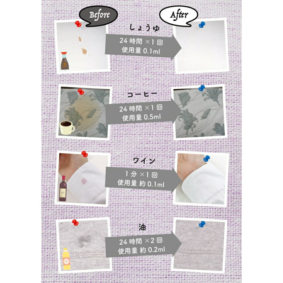 商品情報商品説明●酵素がシミを分解除去。一番人気のスタンダードサイズ。●ノズルの先端は細くなっているのでスポットのシミに向く。●旅行や出張に丁度良いサイズ。●ポーチに入れて携帯用に便利なサイズ。●初めての方向けのお試しサイズ。●食べこぼし、醤油、血液などいろいろな種類のシミを落とせます。●楽しく食べて、楽しくシミ落とし!パラベン・アルコールフリーなので水洗いで流せます。●ノズルは少量ずつ液が出て無駄な消費することなく使えます。●落ちなかったシミもスポッとる を少量塗るだけ。面倒な浸け置き等は必要ありません。●パラベン・アルコールフリーなので水洗いで流せます。●スポッとるは少量でしっかりと浸透し作用します。(たくさん塗っても効果に変わりはありません。)※色落ちしやすい素材、水に濡らすとよくない素材、本革・合皮にはご使用いただけません。商品規格■商品サイズ (約)幅2×奥行1.7×高さ14cm■容量 (約)20ml■重量 (約)70g■成分 炭酸水素ナトリウム、過酸化水素、界面活性剤(ポリオキシエチレンアルキルエーテル)、酵素■使用目安 シミ1cm 四方×約48箇所分■原産国 日本ハッシュ 酵素分解シミ抜き スポッとる スタンダード 20ml 酵素がシミを分解除去。一番人気のスタンダードサイズ。 いろいろな種類のシミを落とせます。 パラベン・アルコールフリーなので水洗いで流せます。 初めての方向けのお試しサイズ。 落ちなかったシミもスポッとる を少量塗るだけ。面倒な浸け置き等は必要ありません 土・日を除く 【1~3営業日以内】 に発送1