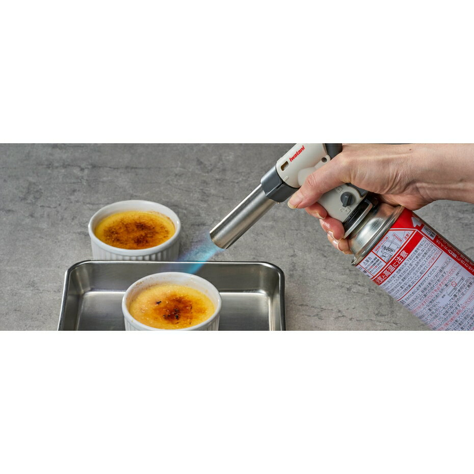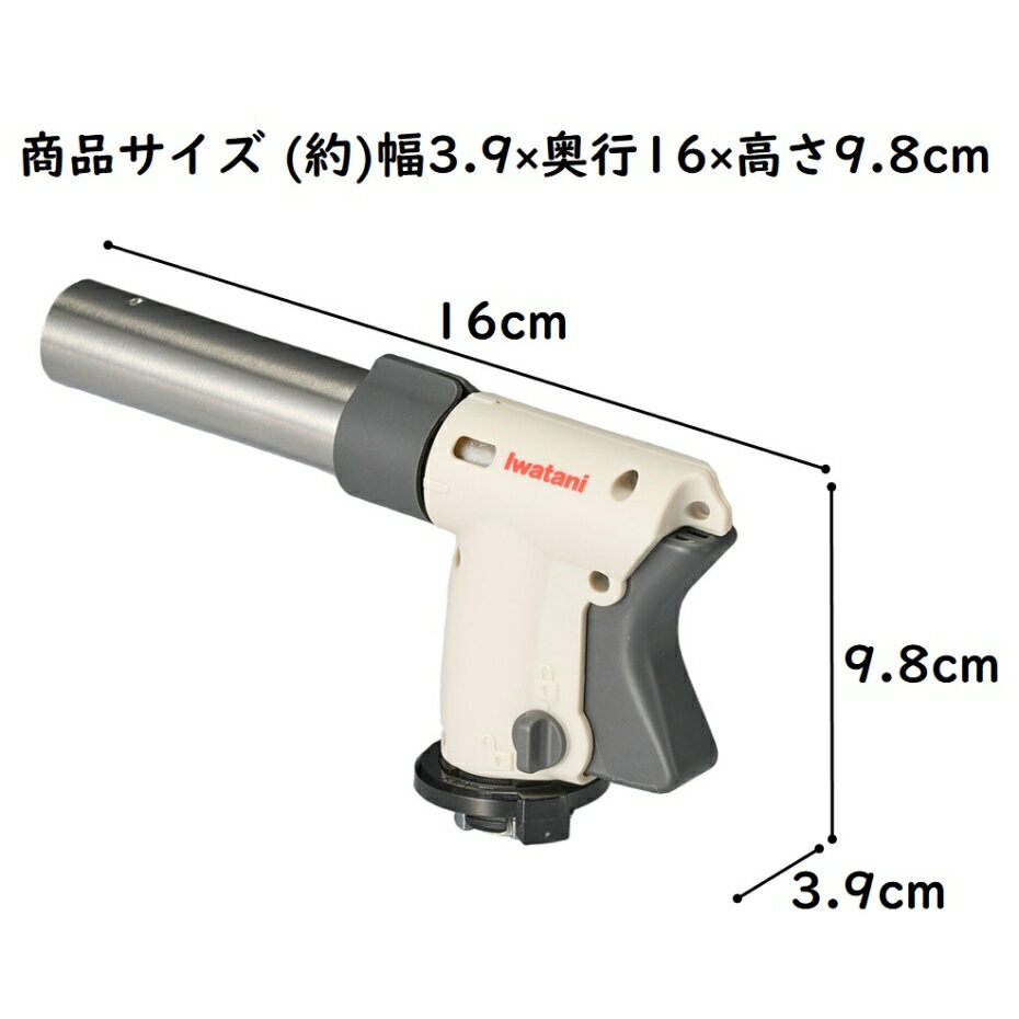 商品情報商品説明●点火レバーを握ると点火、離すと瞬時に消火する新構造。●炙りや焦げ目をつけて、料理をアップグレード。●日本ガス機器検査協会認定品。●使用しない時に点火レバーを固定するロックつまみ搭載。●点火レバーを後方に配置し、力の入りやすい手のひらで握って点火する新デザイン。●火力調整つまみを無くし、ワンアクションで点火・消火が可能です。従来品に比べ、消火時の残火が少ない構造です。●炎調節つまみを右方向(時計回り)に回すと細くとがった炎に、左方向(反時計回り)に回すとやわらかく広がった炎に調整が可能●カセットボンベの着脱がカンタン。ボンベをガイドに合わせて回すだけ!●2025年2月6日に施行された「液化石油ガスの保安の確保及び取引の適正化に関する法律」(液石法)の法令改正に基づき、国で定められた技術基準を満たす「◇PSLPGマーク」を表示。※PSLPGマークとは、日本における液化石油ガス関連の製品に対する安全基準を示すマークのことです。商品規格■商品サイズ (約)本体のみ:幅3.9×奥行16×高さ9.8cm 使用時:幅6.8×奥行16×高さ27cm■重量 (約)本体のみ:201g 本体+未使用カセットガス:549g■材質 本体:ナイロン バーナー火口:ステンレス 点火レバー:ナイロン+ガラス繊維 ロックつまみ:ABS樹脂■最大発熱量 (約)イワタニカセットガス使用時:1.9kW(約1,620Kcal/h) パワーゴールド使用時:2.3kW(約1,980Kcal/h)■最大火炎温度 (約)1,400℃■ガス消費量 (約)140g/h ※気温20~25℃のとき、5分間のガス消費量を1時間換算したもの■連続燃焼時間 (約)イワタニカセットガス:110分 イワタニカセットガスパワーゴールド:90分 ※気温20~25℃のとき、強火で断続使用したときの目安時間(5分以上の連続使用はしないでください)■点火方式 圧電点火方式■容器着脱方式 押込半回転方式■使用ガス イワタニカセットガス イワタニカセットガスパワーゴールド■生産国 日本届け出事業者:岩谷産業株式会社PSマークの種類:PSLPG登録検査機関名称:JIA岩谷 イワタニ カセットガスクッキングトーチバーナー 炙りの達人 CB-TC-CKWHP【PSLPG適合品】 点火レバーを握ると点火、離すと瞬時に消火する新構造。 炙りや焦げ目をつけて、料理をアップグレード。 点火レバーを握ると点火、離すと消火する安全設計。 点火レバーの誤操作を防ぐ「ロックつまみ」を搭載。 火力調整つまみを無くし、ワンアクションで点火・消火が可能です。従来品に比べ、消火時の残火が少ない構造です。 1