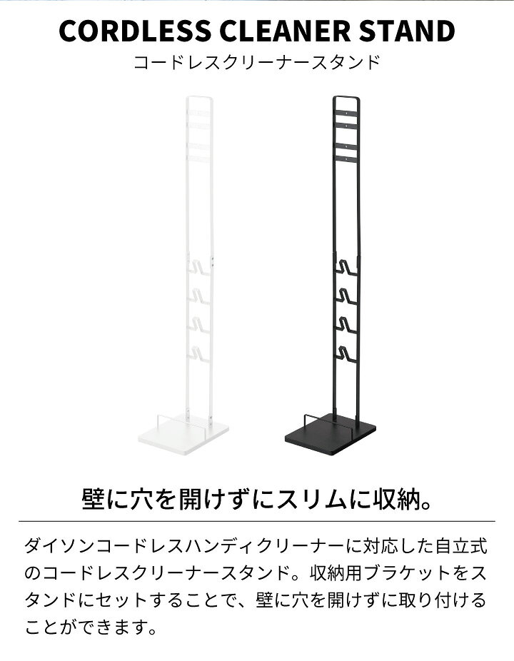 【商品詳細】 サイズ 約 幅 220mm×奥行き 290mm×高さ 1270mm 対応サイズ 差し込み口の内径が約 3cm以上のクリーナーツール 重 量 約3.3kg 材 質 スチール( 粉体塗装 ) 耐荷重 約 4kg 付属品 六角レンチ、スパナ 対応機種 ダイソンコードレスクリーナー( 収納ブラケット対応モデル ) V11シリーズ / V10シリーズ / V8シリーズ / V8slimシリーズ / V7シリーズ / V6シリーズ / V6シリーズ以前( DC74 / DC62 / DC61 / DC59 / DC58 ) ※2020年12月28日時点 カラー ホワイト ブラック 備 考 ・組立式 ・掃除機、収納用ブラケット、クリーナーツールは付属しておりません。 ・ご使用の際には、収納用ブラケットが別途必要です。 ポイント! ●壁に穴を開けずにスリムに収納。 ダイソンコードレスハンディクリーナーに対応した自立式の コードレスクリーナースタンド。収納用ブラケットをスタンドに セットすることで壁に穴を開けずに取り付けることができます。 ●モーターヘッドも収納可能 クリーナーツールやクリーナーヘッドもひとまとめに。すべてがコンパクトに 収まる、省スペース設計でスタイリッシュなスタンドです。 ●充電も簡単に。 立てた状態ですっきり収納しながら充電ができ、必要な時に サッと手に取って使えます。 ご注意 ※サイズは個体により若干差異が生じることがあります。 ※不安定な場所を避け、平らな場所に設置してください。 ※転倒防止のため、必ず壁に寄せて使用してください。 ※差し方により、ツール同士が接触することがあります。 ※直射日光や火が直接あたる場所、高温になる所では使用しないでください。 ※重量の偏りがないよう、バランスよく収納してください。 ※耐荷重を超えるものは絶対に収納しないでください。 JAN:ホワイト…4903208035408 ブラック…4903208035415 品番:ホワイト…3540 ブラック…3541 掃除機スタンド 掃除機 スタンド 掃除機収納 収納 掃除機立て 収納スタンド 収納家具 自立式 自立 立つ 自立する スチール製 スリム コンパクト デザイン 省スペース デッドスペース 空間 空間利用 機能的 使いやすい シンプル おしゃれ オシャレ お洒落 モノトーン スタイリッシュ 便利グッズ 白 ホワイト 黒 ブラック 便利 用途 Tower 山崎実業 YAMAZAKI タワーシリーズ 送料無料壁に穴を開けずにコードレスクリーナーをスリムに収納。モーターヘッドやクリーナーツールを一括収納できます! tower コードレスクリーナースタンド