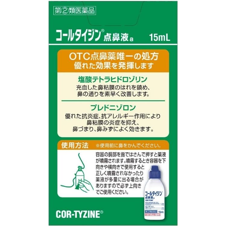 商品情報商品名コールタイジン点鼻液a容量15ml × 2個医薬品区分一般用医薬品薬効分類鼻炎用点鼻薬製品の特徴コールタイジン点鼻液aは,アレルギー性鼻炎又は副鼻腔炎による鼻づまり,鼻みずなど不快な鼻炎症状を改善する鼻炎用点鼻薬です。使用上の注意■してはいけないこと【守らないと現在の症状が悪化したり,副作用が起こりやすくなります】1.次の人は使用しないでください(1)患部が化膿している人。(2)モノアミン酸化酵素(MAO)阻害剤(セレギリン塩酸塩等)で治療を受けている人。2.長期連用しないでください■相談すること1.次の人は使用前に医師,薬剤師又は登録販売者に相談してください(1)医師の治療を受けている人。(2)妊婦又は妊娠していると思われる人。(3)薬などによりアレルギー症状を起こしたことがある人。(4)次の診断を受けた人。 高血圧,心臓病,糖尿病,甲状腺機能障害,緑内障(5)高齢者。2.使用後,次の症状があらわれた場合は副作用の可能性があるので,直ちに使用を中止し,この文書を持って医師,薬剤師又は登録販売者に相談してください[関係部位:症状]皮膚:発疹・発赤,かゆみ精神神経系:眠気,頭痛,めまい,ふるえ,不眠,脱力感鼻:はれ,刺激感,熱感,乾燥感,鼻みずその他:血圧上昇,動悸,不整脈,口の渇き,味覚異常3.3日間位使用しても症状がよくならない場合は使用を中止し,この文書を持って医師,薬剤師又は登録販売者に相談してください効能・効果急性鼻炎,アレルギー性鼻炎又は副鼻腔炎による次の諸症状の緩和:鼻づまり,鼻みず(鼻汁過多),くしゃみ,頭重(頭が重い)用法・用量[年齢:1回量:1日使用回数]成人(15歳以上):1〜2度ずつ鼻腔内に噴霧します。:3時間以上の間隔をおいて,6回まで使用できます。7歳以上15歳未満:1〜2度ずつ鼻腔内に噴霧します。:3時間以上の間隔をおいて,6回まで使用できます。7歳未満:使用しないでください。用法関連注意(1)用法・用量を厳守してください。(2)過度に使用すると,かえって鼻づまりを起こすことがあります。(3)小児に使用させる場合には,保護者の指導監督のもとに使用させてください。(4)点鼻用にのみ使用してください。(5)目には使用しないでください。成分分量1mL中成分・分量塩酸テトラヒドロゾリン 1.0mgプレドニゾロン 0.2mg添加物果糖,ベンザルコニウム塩化物,エタノール,pH調整剤保管及び取扱い上の注意(1)直射日光の当たらない涼しい所に密栓して保管してください。(2)小児の手の届かない所に保管してください。(3)他の容器に入れ替えないでください(誤用の原因になったり品質が変わります。)。(4)他の人と共用しないでください。(5)使用期限(外箱及び容器に記載)をすぎた製品は使用しないでください。消費者相談窓口会社名:JNTLコンシューマーヘルス株式会社問い合わせ先:お客様相談室電話:0120-101110受付時間:9:00〜17:00(土、日、祝日を除く)製造販売会社株式会社陽進堂939-2723 富山県富山市婦中町萩島3697番地8号販売会社JNTLコンシューマーヘルス株式会社剤形噴霧剤リスク区分第「2」類医薬品区分日本製・医薬品広告文責株式会社Glood roi070-8435-9613【指定第2類医薬品】【2個セット】 アリナミン製薬 コールタイジン点鼻液a 15ml 鼻炎薬 鼻炎 鼻炎点鼻液 アレルギー性鼻炎 鼻づまり 鼻水 鼻みず 送料無料 コールタイジン点鼻液aは、アレルギー性鼻炎又は副鼻腔炎による鼻づまり、鼻みずなど不快な鼻炎症状を改善する鼻炎用点鼻薬です。 5