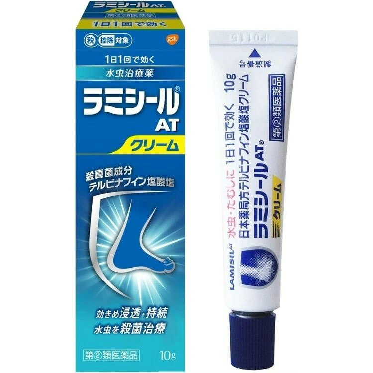 商品情報商品名ラミシールATクリーム容量10g × 10個医薬品区分一般用医薬品薬効分類みずむし・たむし用薬製品の特徴●有効成分である「テルビナフィン塩酸塩」の優れた殺真菌作用と角質層への浸透力は,1日1回の塗布で薬剤が患部に留まり,かゆみや痛み等を引き起こす水虫・たむしに持続的に効果を発揮し,症状を治していきます。●べとつかない,サラッとした使いごこちのよいクリームです。びらん(ジュクジュク)型の患部にお勧めします。使用上の注意■してはいけないこと(守らないと現在の症状が悪化したり,副作用が起こりやすくなります)1.次の人は使用しないで下さい 本剤又は本剤の成分によりアレルギー症状(例えば,発疹・発赤,かゆみ,はれ等)を起こしたことがある人2.次の部位には使用しないで下さい (1)目や目の周囲,粘膜(例えば,口腔,鼻腔,膣等),陰のう,外陰部等 (2)湿疹 (3)湿潤,ただれ,亀裂や外傷のひどい患部■相談すること1.次の人は使用前に医師,薬剤師又は登録販売者に相談して下さい (1)医師の治療を受けている人 (2)妊婦又は妊娠している可能性のある人 (3)乳幼児 (4)薬などによりアレルギー症状を起こしたことがある人 (5)患部が顔面又は広範囲の人 (6)患部が化膿している人 (7)「湿疹」か「みずむし,いんきんたむし,ぜにたむし」かがはっきりしない人 (陰のうにかゆみ・ただれ等の症状がある場合は,湿疹等他の原因による場合が多い。)2.使用後,次の症状があらわれた場合は副作用の可能性があるので,直ちに使用を中止し,この説明文書を持って医師,薬剤師又は登録販売者に相談して下さい[関係部位:症状]皮ふ:かぶれ,刺激感,熱感,鱗屑(りんせつ)・落屑(らくせつ)(フケ,アカのような皮ふのはがれ),ただれ,乾燥・つっぱり感,皮ふの亀裂,いたみ,色素沈着,発疹・発赤*,かゆみ*,はれ*,じんましん* *:全身に発現することがあります。3.2週間位使用しても症状が良くならない場合や,本剤の使用により症状が悪化した場合は使用を中止し,この説明文書を持って医師,薬剤師又は登録販売者に相談してください効能・効果水虫,いんきんたむし,ぜにたむし用法・用量1日1回,適量を患部に塗布してください。用法関連注意1.定められた用法を厳守してください。2.患部やその周囲が汚れたまま使用しないでください。3.本剤のついた手で,目や粘膜にふれないでください。4.目に入らないように注意してください。万一,目に入った場合には,すぐに水又はぬるま湯で洗い,直ちに眼科医の診療を受けてください。5.小児に使用させる場合には,保護者の指導監督のもとに使用させてください。6.外用にのみ使用してください。成分分量1g中テルビナフィン塩酸塩 10mg添加物セタノール,ステアリルアルコール,パルミチン酸セチル,ミリスチン酸イソプロピル,モノステアリン酸ソルビタン,ポリソルベート60,ベンジルアルコール,pH調節剤保管及び取扱い上の注意1.直射日光の当たらない涼しい所に密栓して保管してください。2.小児の手の届かない所に保管してください。3.他の容器に入れ替えないでください(誤用の原因になったり,品質が変わります。)。4.使用期限をすぎた製品は使用しないでください。また,開封後は使用期限内であってもなるべく速やかに使用してください。消費者相談窓口グラクソ・スミスクライン・コンシューマー・ヘルスケア・ジャパン株式会社お客様相談室電話:0120-099-301受付時間:9:00〜17:00(土,日,祝日を除く)上記以外の時間で,誤飲,誤用,過量使用等の緊急のお問い合わせは下記機関もご利用いただけます。連絡先:公益財団法人 日本中毒情報センター 中毒110番電話:072-727-2499(24時間対応、365日対応)製造販売会社グラクソ・スミスクライン・コンシューマー・ヘルスケア・ジャパン株式会社東京都港区赤坂1-8-1剤形塗布剤リスク区分指定第2類医薬品区分日本製・医薬品広告文責株式会社Glood roi070-8435-9613【指定第2類医薬品】【10個セット】 GSK ラミシールATクリーム 10g 水虫薬 グラクソ・スミスクライン 水虫 水虫治療薬 たむし ラミシールクリーム 送料無料 「ラミシールATクリーム 10g」は、1日1回で効く、水虫・たむし用薬です。水虫・たむしは白癬菌「水虫菌」というカビ(真菌)が皮ふ表面にある角質層に感染・寄生しておきる皮ふ病です。ラミシールATクリームは、スイス・ノバルティス社が開発した殺真菌成分テルビナフィン塩酸塩を配合する水虫・たむし治療薬です。 5