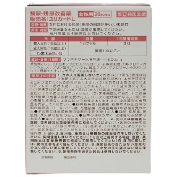 商品情報商品名ユリガードL内容量20カプセル × 2個使用上の注意■してはいけないこと(守らないと現在の症状が悪化したり,副作用・事故が起こりやすくなります)1.次の人は服用しないでください (1)男性(男性は前立腺肥大症による症状の可能性があり,本剤を服用すると尿が出にくくなる恐れがあります)。 (2)本剤又は本剤の成分によりアレルギー症状を起こしたことがある人。 (3)15歳未満の小児。 (4)妊婦又は妊娠していると思われる人(妊娠中の服用については,安全性が十分に確認されていません)。 (5)医療機関にて幽門,十二指腸及び腸管の閉塞の診断を受けた人。 (6)次の症状等がある人(何らかの重篤な疾患等による症状の可能性がありますので,泌尿器科の専門医を受診してください)。 ●脳脊髄疾患(脳腫瘍,脳梗塞や脳出血等の脳血管障害,パーキンソン病,脊髄損傷,脊椎腫瘍等)の診断を受けた人 ●子宮癌又は直腸癌等の骨盤内手術を受けた人 ●血尿,排尿痛,膀胱痛,尿失禁の症状のある人 ●日中の頻尿がなく,就寝後のみ頻尿のある人 ●発症が急性(発症後1ヵ月以内)の人2.本剤を服用している間は,次のいずれの医薬品も服用しないでください 胃腸鎮痛鎮痙薬,ロートエキスを含有する胃腸薬,乗物酔い薬,鼻炎用内服薬,かぜ薬3.服用後,乗物又は機械類の運転操作をしないでください (眠気や目のかすみ,異常なまぶしさ等の症状があらわれることがあります。)4.服用前後は飲酒しないでください5.長期連用しないでください (1ヵ月以上服用する場合,医師,薬剤師又は登録販売者に相談して服用してください。)■相談すること1.次の人は服用前に医師,薬剤師又は登録販売者に相談してください (1)医師の治療を受けている人。 (2)授乳中の人。 (3)高齢者。 (4)薬などによりアレルギー症状を起こしたことがある人。 (5)次の診断を受けた人。 心臓病,緑内障,肝臓病2.服用後,次の症状があらわれた場合は副作用の可能性がありますので,直ちに服用を中止し,この添付文書を持って医師,薬剤師又は登録販売者に相談してください[関係部位:症状]皮膚:発疹・発赤,かゆみ消化器:胃部不快感,食欲不振,吐き気・嘔吐,胃痛,腹痛,胸やけ精神神経系:頭痛,めまい,頭部のふらふら感,しびれ感,不眠泌尿器:排尿困難,尿閉その他:下腹部膨満感,ほてり,異常なまぶしさ,つかれ目,動悸,胸部不快感,咽頭部違和感,かれ声 まれに次の重篤な症状が起こることがあります。その場合は直ちに医師の診療を受けてください。[症状の名称:症状]ショック(アナフィラキシー):服用後すぐに,皮膚のかゆみ,じんましん,声のかすれ,くしゃみ,のどのかゆみ,息苦しさ,動悸,意識の混濁等があらわれる。肝機能障害:発熱,かゆみ,発疹,黄疸(皮膚や白目が黄色くなる),褐色尿,全身のだるさ,食欲不振等があらわれる。3.服用後,次の症状があらわれることがありますので,このような症状の持続又は増強が見られた場合には,服用を中止し,この添付文書を持って医師,薬剤師又は登録販売者に相談してください 口のかわき,便秘,下痢,眠気4.1週間服用しても症状がよくならない場合は服用を中止し,この添付文書を持って医師,薬剤師又は登録販売者に相談してください (他に何らかの疾患があることによる症状の可能性がありますので,泌尿器科の専門医を受診してください。)効能・効果女性における頻尿(排尿の回数が多い),残尿感用法・用量次の量を水又は温湯で服用してください。服用間隔は4時間以上おいてください。[年齢:1回量:1日服用回数]成人女性(15歳以上):1カプセル:3回成人男性(15歳以上):服用しないこと15歳未満の小児:服用しないこと用法関連注意(1)用法・用量を厳守してください。(2)カプセルの取り出し方: カプセルの入っているPTPシートの凸部を指先で強く押して,裏面のアルミ箔を破り,取り出して服用してください。(誤ってそのまま飲み込んだりすると食道粘膜に突き刺さる等思わぬ事故につながります。)成分分量3カプセル中フラボキサート塩酸塩 600mg添加物ヒドロキシプロピルセルロース,乳糖水和物,カルメロースカルシウム(CMC-Ca),ステアリン酸マグネシウム,酸化チタン,マクロゴール4000,ラウリル硫酸ナトリウム,ゼラチン保管及び取扱い上の注意(1)高温をさけ,直射日光の当たらない湿気の少ない涼しい所に保管してください。(2)小児の手の届かない所に保管してください。(3)他の容器に入れ替えないでください。(誤用の原因になったり品質が変わります。)(4)PTPのアルミ箔が破れたり,中身のカプセルが破損しないように,保管及び携帯に注意してください。(5)使用期限(外箱に記載)を過ぎた製品は服用しないでください。消費者相談窓口会社名:薬王製薬株式会社問い合わせ先:お客様相談室電話:0744-33-8855受付時間:9:00〜17:00(土,日,祝日を除く)製造販売会社薬王製薬(株)会社名:薬王製薬株式会社住所:奈良県磯城郡田原本町245番地剤形カプセルリスク区分指定第2類医薬品区分日本製・医薬品広告文責株式会社Glood roi070-8435-9613【指定第2類医薬品】【2個セット】 薬王製薬 ユリガードL 20カプセル 頻尿