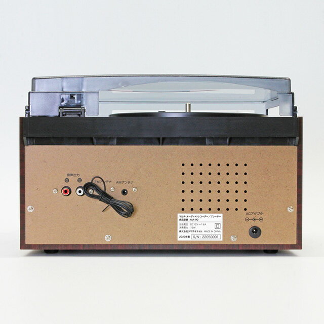製品仕様 商品名 多機能オーディオレコーダー 品番 MA-90 JANコード 4515997002433 セット内容 MA-90本体、ACアダプタ、リモートコントローラー(動作確認用電池含む)、AMラジオ用ループアンテナ、45回転レコード用アダプタ、交換用レコード針、取扱説明書 本体材質 フロントパネル:ABS樹脂、PVC キャビネット:MDF樹脂 仕様 電源:ACアダプタ:DC12V 1.6A 消費電力:16W 待機電力:2W以下 最大外形寸法(約):蓋閉時:幅330 × 高205 × 奥295 mm、蓋開時:幅330 × 高415 × 奥295 mm 重量(約):3.2kg 入力端子:外部音声(3.5mmステレオ・ミニ) 出力端子:ステレオ・ヘッドホン(3.5mmステレオ・ミニ)、外部音声(ステレオ:RCAピン端子)、ループアンテナ(3.5mmミニ) 生産国 中国 セット品詳細 【スピーカー】 インピーダンス:8Ω 実用最大出力:3W + 3W 周波数特性:50Hz〜18kHz 【AM/FMラジオ】 受信可能周波数:AM : 522〜1629kHz、FM : 76〜108MHz ※ワイドFM対応 【レコードプレーヤー】 回転数:33 1/3、45、78 駆動方式:ベルトドライブ 【カセット】 対応テープ形式:Type1 : ノーマル ※両面60分以内推奨 【CD】 対応ディスク:オーディオCD、CD-R/CD-RW 対応ファイルフォーマット:CD-DA、MP3、WMA 再生対応ビットレート/サンプリング周波数:CD-DA:16Bit 44.1kHz、MP3:64〜320kbps 【SD/SDHCカード】 対応メディア:SD/SDHC CLASS4 ディスク容量:128MB 〜 32GB ※2GB推奨 対応ファイルフォーマット:再生:MP3、WMA 録音:MP3、データコピー:MP3、WMA 対応ビットレート:再生:64 〜 320kbps、録音:128 kbps 【USBメモリ】 対応メディア:USBメモリ 2.0/3.0 ディスク容量:128MB 〜 16GB ※2~8GB推奨 対応ファイルフォーマット:再生:MP3、WMA 録音:MP3、データコピー:MP3、WMA 対応ビットレート:再生:64 〜 320kbps、録音:128 kbps 【ACアダプタ】 定格電圧/電流:入力:AC100-240V 50/60Hz 出力:12V 1.6A 最大外形寸法(約):幅:47 × 高:84 × 奥:36 mm 質量(約):128g コード長(約):1500 mm 【AMラジオ用ループアンテナ】 最大外形寸法(組立時:約):幅:132 × 高:130 × 奥:56 mm 質量(約):4g コード長(約):1200 mm 材質:ABS樹脂 【45回転レコード用アダプタ】 最大外形寸法(約):直径37 × 高7 mm 質量(約):2g 材質:ABS樹脂 【リモートコントローラー】 電源:ボタン型電池:CR2025(3V)× 1 最大外形寸法(約):幅39 × 高85 × 奥6mm 質量(約/電池含まず):12g 材質:ABS樹脂、PVC 【交換用レコード針】 最大外形寸法(約):幅14 × 高13 × 奥19 mm 質量(約/電池含まず):1g 使用可能時間(約):200時間 材質:針:サファイア、カートリッジ:ABS樹脂 商品説明 再生はレコード、CD、カセット・テープ、AM/FMラジオ、外部機器、さらにSDカード/USBメモリと多彩。それらの音声をSDカード/USBメモリにデジタル録音。さらにカセットテープにも録音が可能なので、メディアを選ばずにご自慢の音楽ライブラリーをどんどん増やせます。 温かい音色を奏でる木製キャビネットの筐体は設置場所に困らないスピーカー内蔵のコンパクト設計。 アナログからデジタルまで、大切な音楽は【MA-90】にマルチにおまかせください。