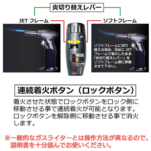 ●商品仕様 材質:(本体)亜鉛ダイキャスト、(グリップ)ラバー塗装 サイズ:H125×W104×T40(mm) 重量:213g 保証期間:2年間 原産国:中国 販売元:株式会社ペンギンライター ●商品説明 各種ホビー、銀細工、キャンプ、花火、焦げ目つけなど、手軽に使えて様々なシーンで活躍してくれるバーナーです。 握りやすいグリップと、押しやすい着火ボタンが特長で、簡単に扱えます。 2年保証商品です。 ※一般的なガスライターとは操作方法が異なるので、説明書を十分読んでお使いください。 ●商品関するお問い合わせ 株式会社ペンギンライター TEL:03-3841-8111 10:00~12:00 / 13:00~17:00 ※土・日・祝日を除く ●警告注意 ・子供の手の届かないころへの保管してください。(子供のいたずらによる火災に注意) ・車中や50℃以上の場所へ置かないでください。大変危険です。 ・薬品(アルコール・シンナー・マニキュア落としなど)の近くに置かないでください。 ・ライター用オイルやカセットガスボンベは絶対に注入しないでください。ハンディバーナー PC-7 商品名 ハンディバーナー PC-7 商品仕様 材質:(本体)亜鉛ダイキャスト、(グリップ)ラバー塗装 サイズ:H125×W104×T40(mm) 重量:213g 商品説明 各種ホビー、銀細工、キャンプ、花火、焦げ目つけなど、手軽に使えて様々なシーンで活躍してくれるバーナーです。 握りやすいグリップと、押しやすい着火ボタンが特長で、簡単に扱えます。 2年保証商品です。 ※一般的なガスライターとは操作方法が異なるので、説明書を十分読んでお使いください。 警告注意 ・子供の手の届かないころへの保管してください。(子供のいたずらによる火災に注意) ・車中や50℃以上の場所へ置かないでください。大変危険です。 ・薬品(アルコール・シンナー・マニキュア落としなど)の近くに置かないでください。 ・ライター用オイルやカセットガスボンベは絶対に注入しないでください。 保証期間2年間 原産国 中国 販売元 株式会社ペンギンライター JANコード 4982397629537