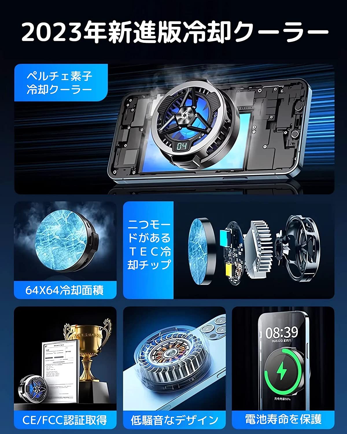 商品情報 商品説明 重量:200 g サイズ:6.7 x 6.4 x 2.63 cm 材質:アルミニウム 電源タイプ:AC/DC 電圧:?5 ボルト (DC) ワット数:15 Watt-hours 騒音レベル:15 ワット 電池使用:いいえ 【ペルチェ冷却・15W(MAX)高出力】 新型ペルチェ冷却方式を採用し、半導体モジュールは周りの温度に関係なく、熱電冷却素子は圧縮機や化学反応を用いることなく電気の力で直接温度差を発生させた、付属な専用電源を入れて3秒ほど驚異的な冷却効果を発揮し、ペルチェ素子(TEC)表面を最低でもマイナス5℃までに冷却できます。本製品を使用している場合、120フレームレートで最高画質のゲーム(原神、荒野行動など)を快適にプレイすることができます。または、スマホの温度上昇をしっかり抑えて、熱から大切なバッテリーを守り、バグ、フリーズ、スピードダウン等の不安を低減してくれて、ゲームや撮影の使用も楽々!!! 【2wayクリップ式・磁力吸着式】 マグネット磁石が内蔵されており、iPhone12シリーズ以降ならiPhone型番は磁力で吸い付いて固定できます。なおクリップと貼り付け用プレートが付属しており、クリップ式で画面サイズが4.7~6.7インチの携帯電話にも対応可能です。磁気対応の取り付けプレートは熱伝導率が高い鉄板と3M製の粘着テープ接着剤で構成されており、iPhoneやAndroidスマホ、Switch、Surface、さらにはiPadやタブレットにも対応可能です。クリップ式でも磁力吸着式でもお楽に使えます。 【2段階パワー調節・温度表示LED】 静音モードとオーバークロックモードの2つの機能が搭載されており、電源ボタンを押すことで冷却モードを切り替えることができます。冷却モードは、個人の好みに合わせて選択することができます。また、温度表示デジタルが付き、ペルチェ素子(TEC)表面の温度数値に一目瞭然です。 【小型・USB給電式・専用アダプター付き】 64x67x26.3mmのコンパクトサイズ、重さ74グラム。小型で軽量、長時間ゲームを楽しんでも手が疲れにくいです。ゲームを邪魔しないように、静音設計でノイズの発生を抑えられ、ほとんど回転する音はなく、ドラマやゲームの音に影響を与えることも心配ありません。周りの人に迷惑をかける心配はありません。ゲームや視聴を楽しむことができます。バッテリーが搭載されない仕様ですが、市販の5V3Aアダプターも付き、付属なケーブルを組み合わせてご使用ください。 【品質保証・付属品内容】 冷却ファン*1台、 USB-A to Cケーブル*1本、 5V3Aアダプター*1個、 クリップ*2件、 貼り付け用プレート*1枚、 透明フィルム*1枚、 英語取扱説明書*1部。 本製品はご購入日から一年間の品質保証と長期間カスタマサポートも付きます。万が一不具合の場合がございましたら、お気軽に当店へお問い合わせください。