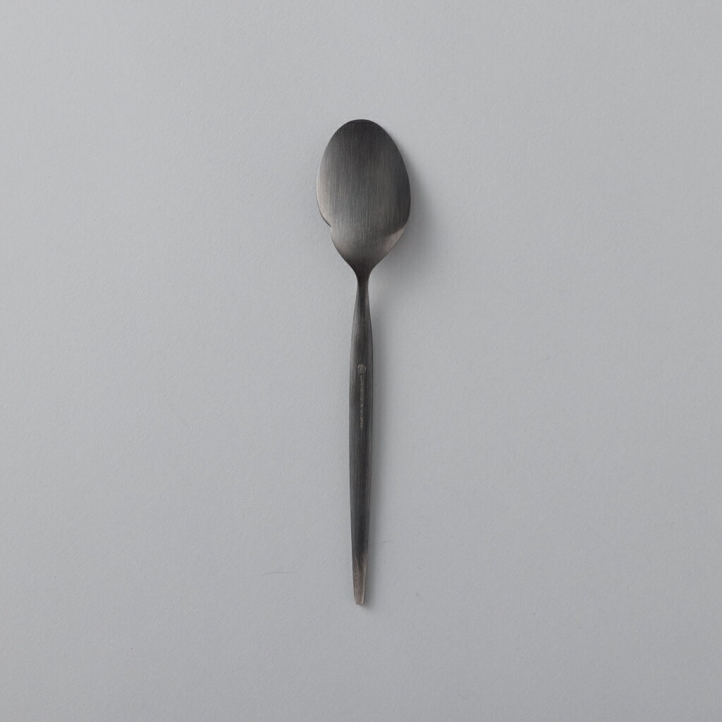 ステンレスの皮膜を調整する「発色」という加工技術で黒色を発色させています。 一本一本異なる色合いが出るのが特徴で、使い続けていただくことで、皮膜の厚みが変わり違う表情を見せてくれる他には無い、ブラックステンレスのカトラリーです。 ハンドルの裏側は膨らみを持たせ、表面は窪ませることで、カトラリーを持った時のフィット感を追求しました。 ソースなども一緒に掬えるよう、ボディは少しフラットな形状になっています。フィッシュスプーンとしてナイフの代わりに魚の身を切ったり、カレーなどにも使いやすくおすすめです。 ステンレスや刃物、洋食器など「金物の産地」として有名な、新潟県の燕三条で一つ一つ丁寧に作っています。 サイズ 長さ16.5 材質 ステンレス 原産国 日本 使用方法 食洗器 :可 使用上の注意 ハンドメイドのため、色ムラ等個体差があります。予めご了承いただき、1点1点の違いをお楽しみください。洗浄の際は中性洗剤をお使いの上、柔らかいスポンジをご使用ください。金属類のタワシはキズやサビの原因になりますのでご使用はおやめください。使用後つけ置きをしてしまうと錆が発生する恐れがありますのでお止めください。また洗浄後は水分をよく拭き取ってから保管してください。