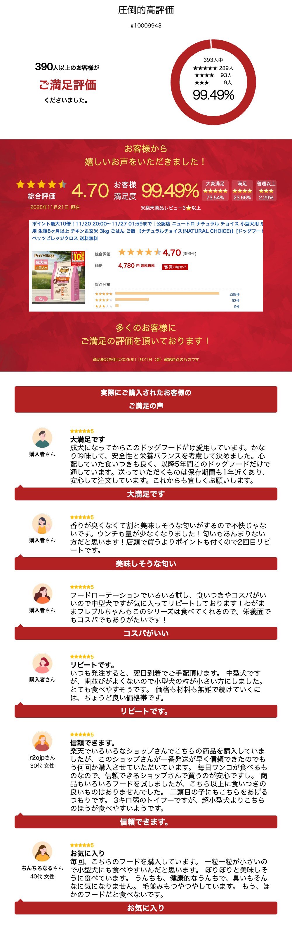 第一主原料にチキン(肉)を使用!好き嫌いが多い小型犬のために、抜群のおいしさを実現 ニュートロTM ナチュラル チョイスTM ドッグフードは厳選した自然素材を使用しています。製品はすべて厳しい独自の検査基準を設け、原材料の品質、均一性、安全性の確保に向けて厳格な検査を行っています。世界のペット栄養学をリードするウォルサム研究所の知見を基に、犬の特徴やライフスタイルに合わせて、最適な素材、最適な栄養バランス、高い嗜好性と消化性を実現し、愛犬の健康維持をサポートします。 ●独自の小粒設計 小型犬でもおいしく食べられるよう粒を小さくし、噛ませるために独自の形状を工夫 ●皮膚・被毛の健康維持 鶏脂や亜麻仁などに含まれるオメガ3と6脂肪酸の適切なバランスを参考に設計し、皮膚・被毛の健康維持をサポート ●同じ小型犬でも大きさは千差万別 チワワの体重(1.5kg - 3kg)はフレンチ・ブルドッグの体重(約8kg)の半分以下。口や顎のサイズが異なります。小型犬に適したフードをあげることが大切です。 ●腸内環境の健康維持 玄米や大麦など、バランスの良い食物繊維の組み合わせで腸内環境の健康維持に配慮。 ●抗酸化成分 長生きの小型犬の健康を維持し免疫力を維持するため、ビタミンE等の抗酸化成分を配合。 ●下部尿路の健康維持に配慮 マグネシウムなどのミネラルバランスを調整し、下部尿路の健康維持に配慮。 ■原材料:チキン(肉)、チキンミール、大麦*2、エンドウマメ、粗挽き米、玄米*2、鶏脂*1*3、タンパク加水分解物、米糠、オートミール、亜麻仁*4、ビートパルプ、チアシード、ココナッツ、トマト、乾燥卵、パンプキン、ケール、ホウレン草、ビタミン類(A、B1、B2、B6、B12、C、D3、E、コリン、ナイアシン、パントテン酸、ビオチン、葉酸)、ミネラル類(カリウム、クロライド、セレン、ナトリウム、マンガン、ヨウ素、亜鉛、鉄、銅)、アミノ酸類(メチオニン)、酸化防止剤(ミックストコフェロール、ローズマリー抽出物、クエン酸) *1 ミックストコフェロールで保存 *2 食物繊維含、*3 オメガ6脂肪酸含、*4 オメガ3脂肪酸含 ■保証成分:タンパク質24.0%以上、脂質16.0%以上、粗繊維4.0%以上、灰分10.0%以上、水分10.0%以上、代謝エネルギー370kcal/100g ■その他含有成分:ビタミンE 60IU/kg以上、カルシウム0.5%以上、リン0.4%以上、セレン 0.35mg/kg以上、オメガ6脂肪酸 2.0%以上、オメガ3脂肪酸 0.2%以上 ■内容量:3kg ■総合栄養食 本品は、ペットフード公正取引協議会の定める分析試験の結果、総合栄養食の基準を満たすことが証明されています ■AAFCO栄養基準 本品は、AAFCO(米国飼料検査官協会)規定の分析試験により、健康維持に適したバランスの良い総合栄養食であることが証明されています。 ■原産国:アメリカ合衆国 ■1日あたりの食事量の目安(g) 体重:g:200ccカップ数 4kg:75:0.9 5kg:90:1.1 6kg:100:1.3 7kg:110:1.4 8kg:125:1.5 9kg:135:1.7 10kg:145:1.8 ■ご注意事項 ・上記給与量の目安は成犬用です。 ・1日の食事量は、上記の表を目安に、愛犬の運動量に合わせて与える量を加減してください。 ・フードの切り替え、給与量の変更は、徐々に行ってください。 ・常に清潔で新鮮な飲み水をご用意ください。 ・上記目安の量を1日2回に分けて与えてください。 ・カップ数の数値は目安です。 ニュートロ ナチュラルチョイス ドッグフード 小型犬用 成犬用(生後8ヶ月以上)チキン&玄米 1kg / 3kg / 6kg ご購入後、商品に不備・不良等がございましたら、下記製造メーカーまでお問い合わせくださいますよう、お願い致します。 ■ニュートロ・グリニーズ お客様相談室 〒113-0033 東京都文京区本郷3-14-11 日平本郷ビル 0120-207-006 平日9:30-16:00 (土日、祝祭日、年末年始12月27日-1月4日を除く) ▼ニュートロ・グリニーズ正規販売店 【本店】楽天ペッツビレッジクロス 【姉妹店】楽天ゆーとぴあ 【姉妹店】楽天カレッツァ ▼ニュートロ公認店 シリアルナンバー No.240010 ※ページ内の画像・文章の無許可の転載、複製、転用等はお断りします。