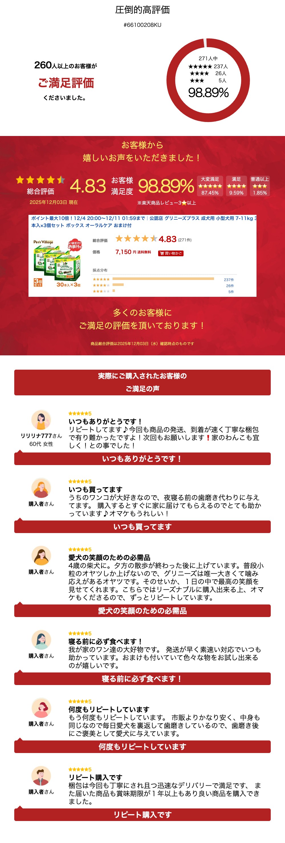 おいしく、楽しく、噛んで歯垢を落とす!グリニーズDOG! わんちゃん実食してみました♪ \今だけ!数量限定/ 何かが、おまけについてくる?!?! 届くまでは、ドキドキ・ワクワク・・・ どうぞ!お楽しみに♪ ※おまけの内容は不定期に変更となる可能性がございます。 ※数量限定のため、おまけが終了することもございます。 ※予めご了承ください。 おいしく噛んで、歯みがき専用ガム「グリニーズ」。主原料は100%自然素材。果実類など、こだわりの自然素材を使用しています。 ■原材料:小麦粉、小麦タンパク、ゼラチン(豚由来)、セルロース、タンパク加水分解物、グリセリン、レシチン、ビタミン類(A、B1、B2、B6、B12、D3、E、コリン、ナイアシン、パントテン酸、ビオチン、葉酸)、ミネラル類(カリウム、カルシウム、クロライド、セレン、マグネシウム、マンガン、ヨウ素、リン、亜鉛、鉄、銅)、着色料(スイカ色素、ゲニパ色素、ウコン色素) ■代謝エネルギー:56kcal/1本 ●糖質が白い斑点となって浮き出ていることがありますが、品質には問題ございませんので、ご安心下さい。 ●茶・黒・赤色の斑点は、原材料である野菜・果物の色です。天然の原材料を使用しておりますので、色・硬さに多少のバラつきが出ることがあります。品質には問題ございませんので、ご安心下さい。 ご購入後、商品に不備・不良等がございましたら、下記製造メーカーまでお問い合わせくださいますよう、お願い致します。 ■ニュートロ・グリニーズ お客様相談室 〒113-0033 東京都文京区本郷3-14-11 日平本郷ビル 0120-207-006 平日9:30-16:00 (土日、祝祭日、年末年始12月27日-1月4日を除く) ▼ニュートロ・グリニーズ正規販売店 【本店】楽天ペッツビレッジクロス 【姉妹店】楽天ゆーとぴあ 【姉妹店】楽天カレッツァ1日1本!噛んで実感!歯みがき効果。歯みがき専用ガム「グリニーズ プラス」。 しっかり噛める弾力性と形状で高い歯みがき効果を発揮。噛んでしつこい歯垢を落とします。 グリニーズ プラスは、Veterinary Oral Health Council(米国獣医口腔衛生協議会)から、から歯垢や歯石の蓄積のコントロールを助ける効果があると承認されています。 各体重別カテゴリーで最も噛む力の強い愛犬でも安心して噛める硬さ、噛むことで効率的に歯垢をつきにくくする弾力性により、優れた歯みがき効果を実現しています。 主原料は100%自然素材。果実類など、こだわりの自然素材を使用しています。 また、アレルゲンとなりにくいといわれる高品質な豚由来のゼラチンや、米粉などを使用し、食物アレルギーにも配慮しています。 愛犬の健康維持をサポートする“総合栄養食”としての基準を満たしています。主食と同等の栄養バランスを満たしているから、栄養を偏らせることなくフードと組み合わせることができます。 さらに、溶解性の高いタンパク質を使用することで、ドライドッグフードよりも優れた消化性を実現しています。(ニュートロジャパン調べ) ※高い消化性を実現する製法について特許申請中。 ●成犬用 小型犬用 7-11kg 原材料 小麦粉、小麦タンパク、ゼラチン(豚由来)、セルロース、タンパク加水分解物、グリセリン、レシチン、ビタミン類(A、B1、B2、B6、B12、D3、E、コリン、ナイアシン、パントテン酸、ビオチン、葉酸)、ミネラル類(カリウム、カルシウム、クロライド、セレン、マグネシウム、マンガン、ヨウ素、リン、亜鉛、鉄、銅)、着色料(スイカ色素、ゲニパ色素、ウコン色素) 保証成分 たん白質 30.0%以上 脂質 5.5%以上 粗繊維 6.0%以下 灰分 6.0%以下 水分 15.0%以下 代謝エネルギー 56kcal/1本 給与方法・ご注意事項 ・1日に1本を目安に与えてください。 ・年齢6ヶ月以上の愛犬に与えてください。 ・主食の量は適宜調節してください。 ・愛犬の体重に適したサイズを与えてください。 ・常に新鮮な水をご用意ください。 ※食べ終わるまで目の届く所で与えてください。飲み込んでしまった時やのどにつかえているような場合は、生命に関わることもありますので、あわてずに取り出すか、獣医師に相談してください。 ※まれに製品の表面に白い点のようなものが見えることがあります。これは製品中のミネラル成分で、品質に問題ありません。 原産国 アメリカ 1本入 6本入 18本入 30本入って超お得!ボックスタイプ(デカパック) グリニーズプラス 全ラインナップ
