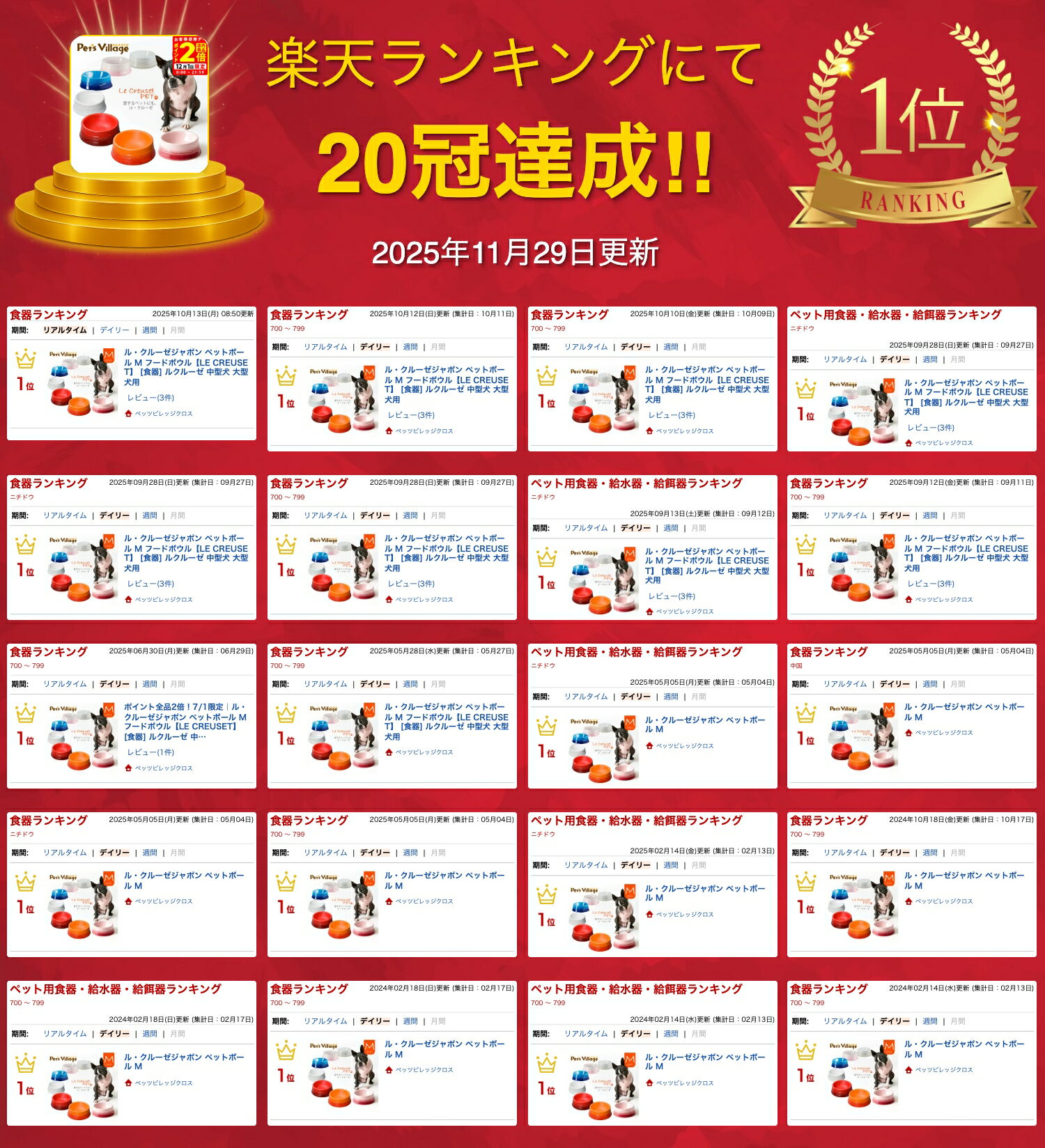 愛するペットにも、ル・クルーゼ! ペットのごはんタイムを可愛く美味しく! 選べる楽しさで、あげてももらってもうれしい。 美しいフォルム、バリエーションが豊富なペット用ボール。 ペットのサイズに合わせてバリエーションも豊富に取り揃えています。 ・しっかりとした重さで、食べているときに動かない。 ・ステンレスやアルミ素材が苦手なペットにもおすすめ。 ・汚れが落としやすく、臭いもつきにくい。 ・電子レンジOK!ドライフードをふやかしたり、少し温めたいときに。ギフトにも最適なシリーズです。 【 ペットボール 】 大切なペット用の食器。 超小型犬におすすめのSSサイズが新登場! Mは中型犬、Sは小型犬や猫におすすめ。 ■Mサイズ 直径:約 18cm 高さ:約 6.5cm 容量:約 500ml 重量:約 770g ■素材:ストーンウェア ■対象:猫、犬 ■対応機器 電子レンジ、オーブン、食器洗い機、冷蔵・冷凍、圧力鍋、蒸し器 ■カラー ・シェルピンク /840457405740 /製造国:タイ ・メレンゲ /840457405733 /製造国:タイ ・アズールブルー /840457405726 /製造国:タイ ・ピンク /0630870293884 /製造国:中国 ※売り切れ次第終売となります。 ・ホワイト /0630870285667 /製造国:中国 ※売り切れ次第終売となります。 ・チェリーレッド /0630870285636 /製造国:中国 ※売り切れ次第終売となります。 ・オレンジ /0630870285650 /製造国:中国 ※売り切れ次第終売となります。 【お知らせ】 リニューアルに伴い、パッケージ・内容等予告なく変更する場合がございます。また、リニューアル時期は旧製品と新製品が混同する場合がございます。予めご了承ください。 よく検索されるキーワード | ウォーターボウル 犬用 猫用 中型犬 大型犬 セラミック製 耐久性 重みがあって滑りにくい 食洗機対応 電子レンジ対応 おしゃれ 高級食器 ギフトにおすすめ カラーバリエーション豊富