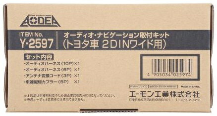エーモン Y2597 オーディオ・ナビゲーション取付キット(トヨタ車 2DINW用) トヨタ車へ市販の2DINワイドカーオーディオ・ナビゲーションの取り付けに 必要な部材がセットされ、簡単・キレイ・スピーディーな取り付けが可能 内容物 オーディオハーネス(10P):1個 オーディオハーネス(6P):1個 アンテナ変換コード(3P):1個 車速配線カプラー(5P):1個エーモン Y2597 オーディオ・ナビゲーション取付キット(トヨタ車 2DINW用) トヨタ車へ市販の2DINワイドカーオーディオ・ナビゲーションの取り付けに 必要な部材がセットされ、簡単・キレイ・スピーディーな取り付けが可能 内容物 オーディオハーネス(10P):1個 オーディオハーネス(6P):1個 アンテナ変換コード(3P):1個 車速配線カプラー(5P):1個