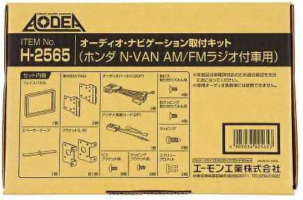 エーモン H2565 オーディオ・ナビゲーション取付キット(ホンダ N-VAN用) ホンダ車へ市販のカーオーディオ・ナビゲーションの取り付けに 必要な部材がセットされ、簡単・キレイ・スピーディーな取り付けが可能 内容物 フェイスパネル:1個 スペーサーテープ:1個 取り付けパネル:2個 ブラケット(L・R):各1個 オーディオハーネス(20P):1個 アンテナ変換コード(2P):1個 M5ビス:8本 φ5タッピング:8本 M5皿ビス:4本 φ5皿タッピング:4本 φ4×16mmタッピング:2本 スクリューグロメット:2個エーモン H2565 オーディオ・ナビゲーション取付キット(ホンダ N-VAN用) ホンダ車へ市販のカーオーディオ・ナビゲーションの取り付けに 必要な部材がセットされ、簡単・キレイ・スピーディーな取り付けが可能 内容物 フェイスパネル:1個 スペーサーテープ:1個 取り付けパネル:2個 ブラケット(L・R):各1個 オーディオハーネス(20P):1個 アンテナ変換コード(2P):1個 M5ビス:8本 φ5タッピング:8本 M5皿ビス:4本 φ5皿タッピング:4本 φ4×16mmタッピング:2本 スクリューグロメット:2個