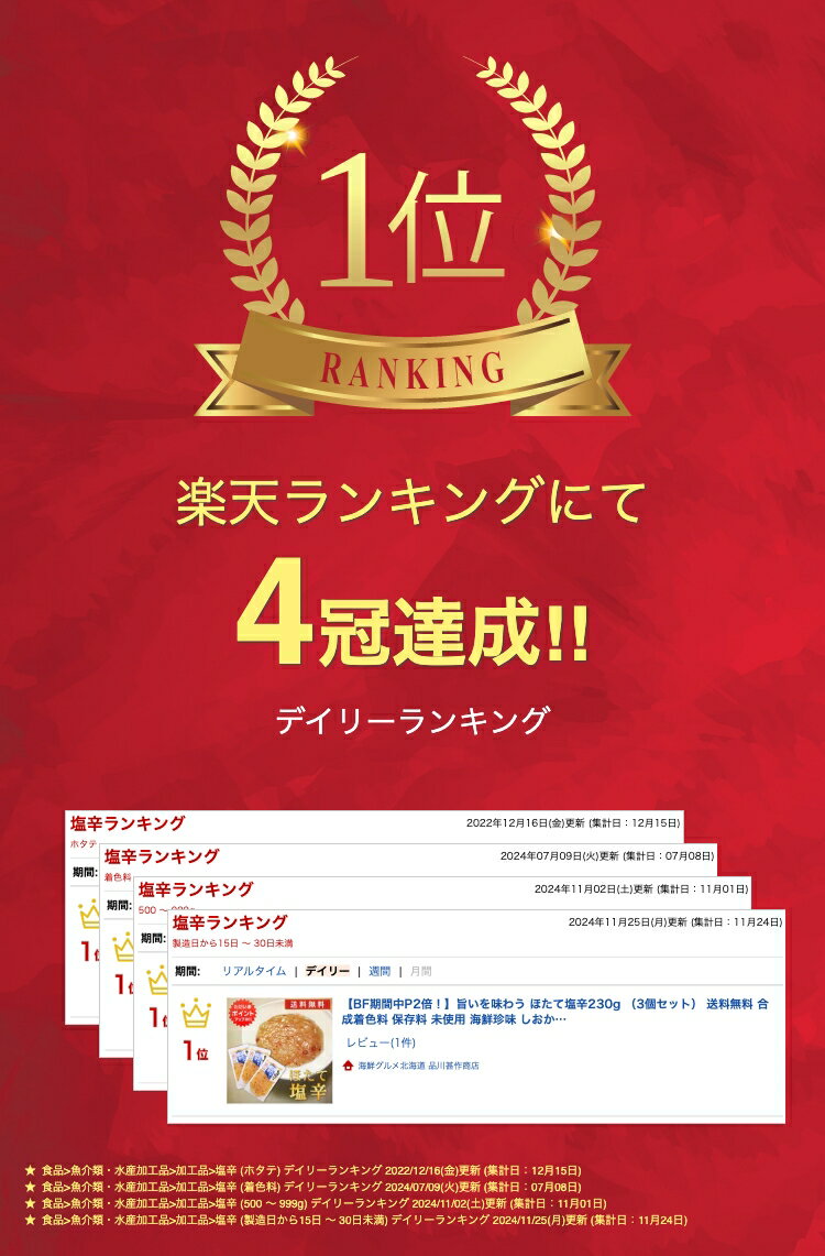 ★ご注意ください★ 沖縄県・離島には別途送料がかかります。 後日送料を変更したメールを送信させて頂きます。 名称 ほたて塩辛 魚介類加工品 販売業者 株式会社品川甚作商店 原材料 ほたて貝ひも (国産)、砂糖、還元水あめ、食塩、、唐辛子、風味調味料/ソルビット, 酒精、調味料 (アミノ酸等)、pH調整剤、増粘多糖類、(一部にさばを含む) 内容量 1個 230g 栄養成分表示 (100g当たり) エネルギー 117kcal 蛋白質 10.2g 脂質 0.7g 炭水化物 18.8g 食塩相当量 3.7g ※この表示値は目安です。 発送温度帯 冷蔵 保存方法 要冷蔵 (10℃以下) 取扱い上の注意 ●ご注文確定後のキャンセルは承ることができません。 ●商品の到着後すぐ商品の状態を確認してください。食べられないほどの潰れや傷みがある場合には、誠にお手数ですが、すぐにご連絡ください。 ●お客様のご都合による返品・交換の対応はできません。 ●お客様のご都合によって商品をお受け取りいただけない場合、送料・商品代をご負担いただきます。 関連商品いか三升漬 140g(3個セット) 送料無料 パウチタイプ 北海道 ピ...旨いを味わう ほたて塩辛230g (5個セット) ◎ 送料無料 合成着...3,100円4,250円おが和 唐味造り真いか塩辛160g (2個セット) 送料無料 イカ し...旨いを味わう ほたて塩辛230g (10個セット) ◎ 送料無料 合成...3,260円7,200円旨いを味わう ほたて塩辛230g (1個) ◎ 合成着色料 保存料 未...旨いを味わう ほたて塩辛230g (8個セット) ◎ 送料無料 合成着...590円6,020円真いか塩辛 肝仕込み 100g(2個セット) 送料無料 北海道産 イカ...旨いを味わう ほっき黄金 190g(3個セット)◎ 送料無料 ホッキ貝...2,900円3,244円旨いを味わう ほたて塩辛230g (2個セット) ◎ 送料無料 合成着...旨いを味わう 切干し松前250g (3個セット) ◎ 送料無料 合成着...2,480円3,400円