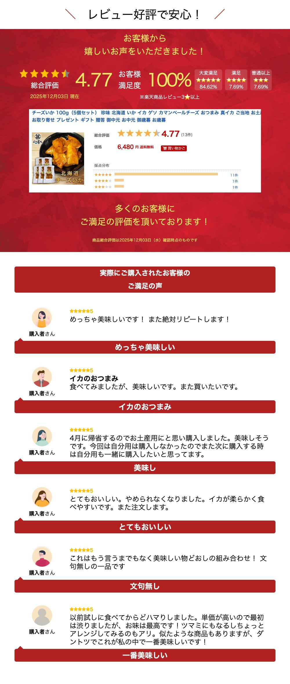 ★ご注意ください★ 沖縄県・離島には別途送料がかかります。 後日送料を変更したメールを送信させて頂きます。 名称 チーズ入りいか 販売業者 株式会社品川甚作商店 原材料 いか(国産)、ナチュラルチーズ、プロセスチーズ、砂糖、食塩、醸造酢、発酵調味料、卵白/ソルビトール、調味料(アミノ酸等)、リン酸塩(Na)、甘味料(ステビア、カンゾウ)、 乳化剤、安定剤(増粘多糖類)、香料、着色料(アナトー色素、タマリンド色素)、(一部に乳成分・卵・大豆・いかを含む) 内容量 1袋 100g 栄養成分表示 (100g当たり) エネルギー 209kcal 蛋白質 22.0g 脂質 9.7g 炭水化物 8.5g 食塩相当量 3.3g ※この表示値は目安です。 発送温度帯 常温 保存方法 直射日光、高温多湿をさけて常温で保存して下さい。 取扱い上の注意 ●ご注文確定後のキャンセルは承ることができません。 ●商品の到着後すぐ商品の状態を確認してください。食べられないほどの潰れや傷みがある場合には、誠にお手数ですが、すぐにご連絡ください。 ●お客様のご都合による返品・交換の対応はできません。 ●お客様のご都合によって商品をお受け取りいただけない場合、送料・商品代をご負担いただきます。 関連商品いかあしチーズ 70g(10個セット) 珍味 北海道 いか イカ ゲソ...チーズいか 100g(3個セット) 珍味 北海道 いか イカ ゲソ カ...7,300円3,888円チーズいか 100g(2個セット) 珍味 北海道 いか イカ ゲソ カ...チーズいか 100g(10個セット) 珍味 北海道 いか イカ ゲソ ...2,592円12,960円チーズいか 100g(1個)珍味 北海道 いか イカ ゲソ カマンベー...北海道カマンベールチーズサンド(10袋セット) ◎ 十勝産 珍味 ちー...1,296円6,800円はやきたカマンベールチーズ 110g (5個セット) ◎ 北海道 安平...カズチー 7粒入り (10袋セット)◎ かずのこチーズ おつまみ お...6,800円6,300円いかあしチーズ 70g(3個セット) 珍味 北海道 いか イカ ゲソ ...いかあしチーズ 70g(5個セット) 珍味 北海道 いか イカ ゲソ ...2,190円3,650円