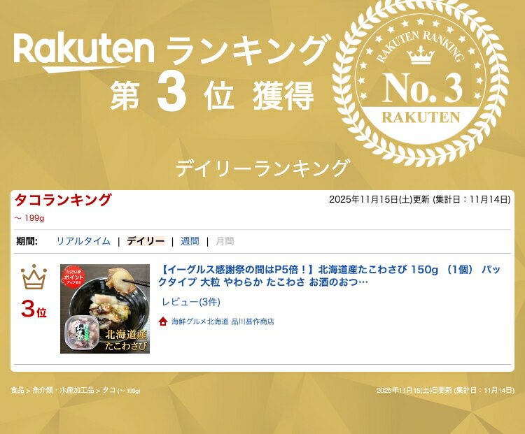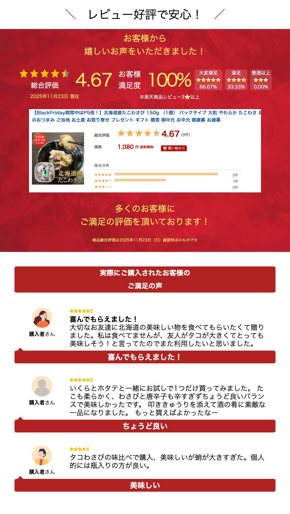 ★ご注意ください★ 沖縄県・離島には別途送料がかかります。 後日送料を変更したメールを送信させて頂きます。 名称 北海道産たこわさび(魚介類加工品) 販売業者 株式会社品川甚作商店 原材料 たこ(北海道産)、発酵調味料、食塩、昆布エキス、茎わさび、唐辛子/ソルビット、調味料(アミノ酸等)、増粘剤(キサンタンガム)、香料(一部に小麦・ゼラチンを含む) 内容量 1個 150g 栄養成分表示 (100g当たり) エネルギー 159kcal 蛋白質 23.3g 脂質 0.7g 炭水化物 14.9g 食塩相当量 2.1g ※この表示値は目安です。 発送温度帯 冷凍 保存方法 要冷凍-18℃以下で保存ください。解凍後は冷蔵で保存しお早めにお召し上がり下さい。 取扱い上の注意 ●ご注文確定後のキャンセルは承ることができません。 ●商品の到着後すぐ商品の状態を確認してください。食べられないほどの潰れや傷みがある場合には、誠にお手数ですが、すぐにご連絡ください。 ●お客様のご都合による返品・交換の対応はできません。 ●お客様のご都合によって商品をお受け取りいただけない場合、送料・商品代をご負担いただきます。 関連商品【BlackFriday期間中はP5倍!】北海道産たこわさび 150g...【BlackFriday期間中はP5倍!】北海道産たこわさび 150g...3,460円5,620円【BlackFriday期間中はP5倍!】北海道産たこわさび 150g...【BlackFriday期間中はP5倍!】北海道産たこわさび 150g...4,540円12,100円【BlackFriday期間中はP5倍!】たこしゃぶ 140g (1個...【BlackFriday期間中はP5倍!】おが和 紅鮭ししゃもっ子90...1,800円1,270円【BlackFriday期間中はP2倍!】選べる海鮮珍味2個セット 1...【BlackFriday期間中はP2倍!】やみつきシャケ 150g (...1,000円1,296円【BlackFriday期間中はP5倍!】釧之助 いかジャン辛 150...【BlackFriday期間中はP5倍!】紅鮭親子ルイベ 180g (...1,180円1,450円