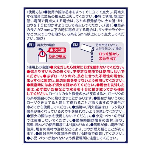 リニューアルに伴いパッケージ・内容等予告なく変更する場合がございます。予めご了承ください。 名 称 カメヤマ 赤芯ローソク セイカ 内容量 20本(560g) 特 徴 ★カメヤマ ローソク ■燃焼時間:約4時間 ■7号5 ■F0804-97-00S 区 分 ロウソク/ベトナム製 ご注意 【ご使用時の注意】●ローソクを灯しているときはその場から絶対に離れないでください。 ●金属・陶器など不燃性でローソクの穴に合った燭台に真っすぐ固定してご使用ください。 ●可燃物の付近では絶対に使用しないでください。 ●風のある所ではロウが流れやすくなり敷物などを汚すことがありますのでご注意下さい。 ●燃焼中、消火直後はやけどの恐れがありますのでローソク及び燭台に手を触れないでください。 ●燭台が熱いうちにローソクを立てると溶けて倒れることがありますので燭台が冷めてからご使用ください。 ●燃焼中、芯糸が長くなり炎が大きくなった場合一旦消火し芯糸の先をはさみで5ミリほどに切り再び点火してください。 ●特に冬場、気温の低い部屋で再点火する場合は、芯糸の根元部分に火を近づけ、ロウを充分に溶かすようにして点火してください。 ●芯糸が2ミリ以下の時に再点火する場合は、マッチの火でロウを溶かし5,6滴捨て、芯糸を5ミリ以上にすると点火しやすくなります。 【保管上の注意】●直射日光や高温所を避け、涼しい場所に保管してください。 ●小児・ペットの手の届かない所に保管してください。 本品記載の使用法・使用上の注意をよくお読みの上ご使用下さい。 販売元 カメヤマ株式会社大阪市北区大淀中2-9-11 お問合せ お客様窓口:0595-82-9837 広告文責 株式会社ツルハグループマーチャンダイジングカスタマーセンター 047-409-4023 JANコード:4901435080499