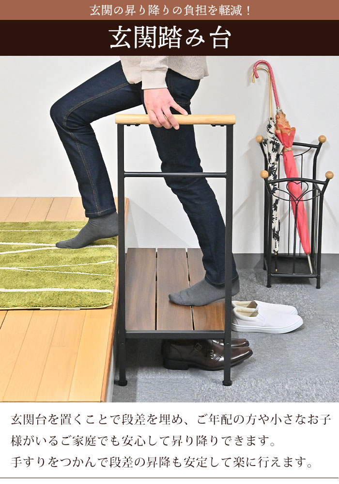 商品情報ご年配・妊婦さん・小さなお子様がいるご家庭におすすめの手すり付き玄関台。踏み台の下には靴も収納でき、玄関スペースを有効活用でき、見た目もスッキリします。アジャスター付なのでガタツキを抑えます。片手すり90cm幅タイプ。左右どちらの向きでも使えます。商品サイズ約幅91×奥行36×高さ88cm商品重量約6.5kg材質〔フレーム〕スチール〔踏み台〕繊維化粧板〔手摺り〕天然木表面加工粉体塗装機能・特徴■片手すり90cmタイプ組立式・完成品組立式カラーブラウン原産国中国仕様変更2022.04.05 生産工場変更により若干の仕様変更あり。同シリーズ安心らくらく玄関台● (片側)幅60cm● (片側)幅90cm● (両側)幅 60cm※このページは[安心らくらく玄関台 90cm(片側)]を販売しております。キーワード踏み台 手すり付き踏み台 玄関台 手すり付き 幅90 手すり 片側 片手 手摺り 昇降 木製 スチール おしゃれ 収納 靴 ステップ 補助台 ステップ台 昇降補助