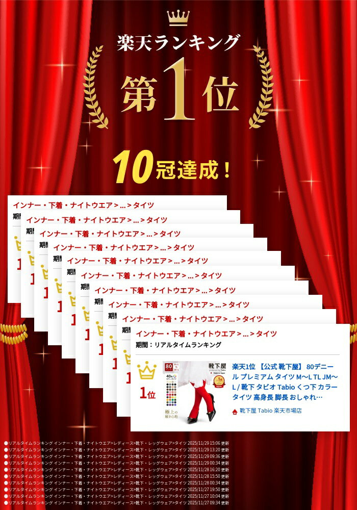 【公式 靴下屋】 レディース 80デニール プレミアムタイツ / 靴下 タビオ Tabio くつ下 レディース 日本製アイテム説明2023年秋にリニューアルし、静電気防止機能がつきました!※販売価格¥1,320以上の製品が対象です。豊富なカラーバリエーションベーシックなカラーはもちろん、色鮮やかなビビットカラー、ニュアンスカラーまで豊富なカラーバリエーションをご用意。プレミアムな感覚でリッチな履き心地!「履き心地が一番いいタイツを作りたい!」そんな想いから生まれた、ワンランク上のタイツ・超極細ハイマルチフィラメント糸使用でソフトな感触・肌に吸い付くような優しいフィット感・透けにくく重すぎない80デニールタイツの定番、80デニール。タイツ選びに迷ったら、まずはこの一品を。座ったときに太ももやひざが少し透ける絶妙な薄さで、デイリーに使いやすいタイプです。選ぶのが楽しくなる豊富なカラーバリエーションも◎※透け感は身長などで多少の個人差があります。超極細のハイマルチフィラメント糸使用で、とっても柔らかく滑らか!プレーティング編み(二重編み)なので、ふわっとした感触で弾力があり、肌に吸い付くようにしっとりと馴染みます。締め付けがやさしい、ソフトウエストタイプです。たくさん肌に触れるタイツだからこそ、履けば必ず違いが分かる極上の履き心地を!靴下屋自慢のタイツ、ぜひお試しください。≪基本ディテール≫・80デニール・プレーティング編・マチ付・ソフトウエスト・つま先スルー・ランガードなし※こちらはM〜Lサイズ、TLサイズ、JM~Lサイズです。◆プレーティング編のヒミツ◆通常、薄手ナイロンタイツは、表糸のみの一重で編むゾッキ編が一般的です。プレーティング編とは、表糸と裏糸で二重に編むこと。ふわっと柔らかかつ弾力性もある心地いい感触で、肌に吸い付くように優しくフィットします。糸が細くなればなるほど編立が難しく、熟練技術が必要となり時間もかかりますが、効率よりも履き心地にこだわり、プレーティング編を採用しています。※こちらのページでは品番011908001、011908002、011908003を販売しています。 素材ナイロン91% ポリウレタン9%素材についてサイズM~L/TL/JM~Lサイズについて レディース ソックスから探すサンダルソックスカバーソックスソックスタイツストッキングレギンス スパッツ トレンカレッグウォーマー5本指タビ冷え着圧スポーツ大きいサイズ メンズ ソックスから探すカバーソックスソックス五本指足袋ビジネススポーツ大きいサイズ小さいサイズ キッズ・ベビー ソックスから探すソックスタイツ五本指タビカバーソックスレッグウォーマーベビーこんなギフトシーンに1月お年賀 寒中見舞い お年玉 年始 年始 挨拶 成人祝い2月バレンタイン 合格祈願 マラソン3月ホワイトデー プチギフト ひなまつり 卒業式 合格祝い 卒業祝い 引っ越し祝い 退職 花見4月入学式 入学祝い 新生活 就職祝い5月母の日 こどもの日 ゴールデンウィーク6月梅雨 ジューンブライド7月夏休み お中元 キャンプ8月暑中 残暑見舞い 盆休み お盆玉 手土産 夏祭り9月敬老の日 お彼岸10月ハロウィン 発表会 運動会 体育祭11月七五三 文化祭 夫婦の日12月クリスマス 年末 年越し お歳暮 冬休み 福袋 帰省誕生日 バースデー プレゼント ギフト グッズ 記念日 贈り物 結婚祝い 出産祝い お返し 内祝い 開店祝い 還暦祝い お祝い 昇進祝い 餞別 お見舞い 20代 30代 40代 50代 60代 70代 80代レディースランキング この商品のその他カラーはこちら 秋冬のお洒落に彩りと心地良さを!カラータイツ40色&40コーデ タイツは秋冬シーズンに欠かせない 重要アイテム。 彩り豊かで高機能、 履き心地の良さもトップクラスな タビオのカラータイツで、 いろんなお洒落を楽しんで! 「プレミアムタイツ」はタビオの定番であり、毎シーズン大人気となっている主力アイテム。その理由は豊富なカラバリだけでなく、徹底的に研究し開発された“履き心地”。そんなこだわりのディテールをチェック! \おかげさまで楽天ランキング1位受賞しました! / 【お詫びとお知らせ】 2025年11月12日(水)18:00より配布いたしました「80デニールプレミアムタイツ3点以上購入で10%OFFクーポン」につきまして、設定に誤りがございました。 本来は3点以上のご購入で全商品に10%OFFが適用される予定でしたが、実際には1点分のみに割引が適用される状態となっておりました。 すでにクーポンをご利用いただいたお客様にはご迷惑をおかけし、誠に申し訳ございません。 該当期間中にご購入いただいたお客様へは、こちらから順次ご連絡をさせていただきますが、内容にお気づきのお客様はお手数ですが弊社までご連絡くださいますようお願い申し上げます。 また、既にクーポンを取得されているお客様につきましては、引き続きご利用は可能ですが、3点以上ご購入いただいた場合でも1点分のみ割引が適用されます。何卒ご了承くださいますようお願い申し上げます。 ※クーポンご利用期限は11/30(日) 
