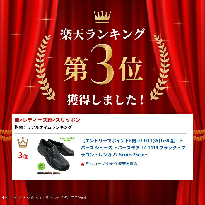 【エントリーでポイント5倍⇒11/27(木)1:59迄】 トパーズ シューズ トパーズモア TZ-1414 ブラック・ブラウン・レンガ 22.5cm〜25cm レディース コンフォートシューズ スリッポン 婦人靴 4E 幅広 ワイド 滑り止め TOPAZ