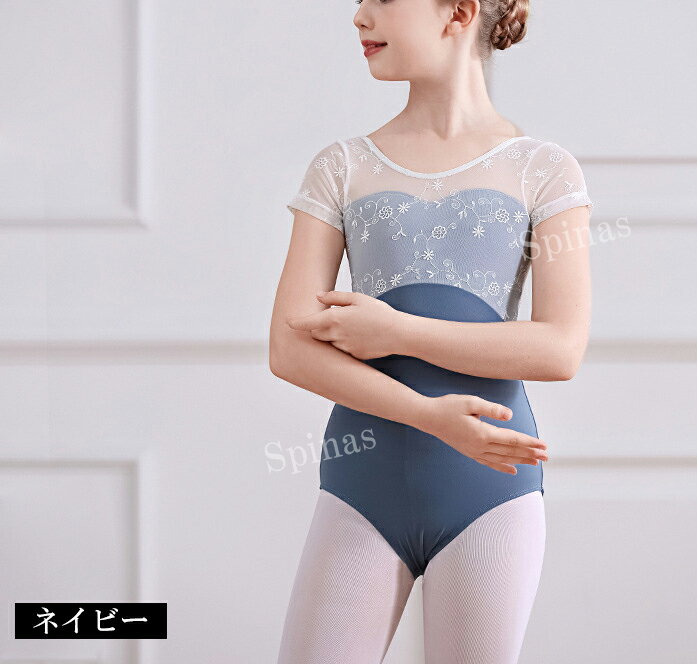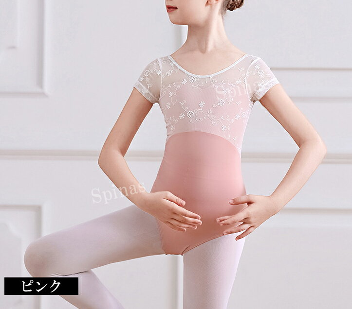 お花のストレッチレースは透け感があって可愛いデザイン!6色展開 バレエレオタード 子供用 半袖 レース スカート無し 刺繍 ソフトメッシュ 配色 切替 キッズ ジュニア バレエ用品 レッスン バレエウェア