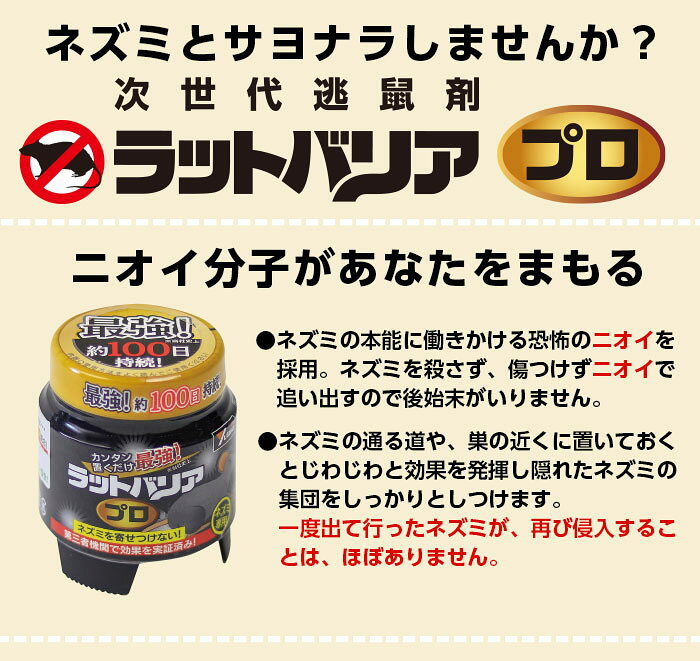 【楽天最強翌日配送について】 楽天最強翌日配送をご希望の場合は、必ずご注文時に最短の配達日をご指定ください。 通常は下記の日程にて出荷予定となります。 日付指定あり:ご注文とご決済を確認後、ご指定日と配送日数を考慮し順次出荷 日付指定なし:ご注文とご決済を確認後、2~4営業日以内に順次出荷 ※出荷日の確認や変更はお受け出来かねます、予めご了承ください。 内容量 約36g/個 素材・材質 本体容器:PET、台座:PP、粒:ケイ酸カルシウム 有効成分 2メチルチアゾリン 製造国 日本 用途 クマネズミ、ドブネズミ、ハツカネズミ等の忌避 効果範囲目安 約6〜8畳 ※使用環境により異なる 持続期間 約100日 ※使用環境により異なる 備考 使用可能温度:−10〜50℃ 使用推奨温度:−5〜35℃ 複数セットでお得! 【ラットバリアシリーズ】 ラットバリア プロ ラットバリア 業務用スティック ラットバリア 業務用溶液 ラットバリアミスト(定期噴霧) ラットバリアセンサー(感知噴霧)ネズミに恐怖心を与えて追い払う、全く新しい逃鼠剤! 【ラットバリア プロ】 ネズミに恐怖を与えて追い払う、次世代逃鼠剤! ネズミが本能的に恐怖を感じるニオイで神経回路を刺激し、ネズミを追い出します。 ネズミが自ら逃げて行くので、面倒な後始末の必要がありません。 有効成分は食品香料由来で安心! 国内特許取得済み(PAT.5350496)、その他世界36カ国に特許申請中。 高い忌避効果で好評のラットバリアに、効果持続タイプが新登場! ●置くだけカンタン ●効果期間は約100日 ●効果範囲は約6〜8畳 この様な場所にお勧め 住宅、商業ビル、工場のネズミ対策に最適です。 天井裏、床下、物置、倉庫など、ネズミが巣が作りやすい場所がオススメです! 約6〜8畳を目安に被害場所に設置してください。 ※空気の流れの大きい場所はニオイが滞留しにくいため、効果が現れにくくなります。 驚きの忌避(きひ)効果! 「猫を飼っている家にはネズミが来ない」、「猫を見たことが無いネズミに飼猫の首輪を与えると、怖がる素振りを見せる」という事は以前から知られていたのですが、2007年の科学雑誌ネイチャーの論文で「先天的な恐怖のニオイを伝える神経回路が、通常のニオイを伝える神経回路とは別に存在する」という事がネズミを使って証明されました。 つまり、何も分からずに天敵に近づいて捕食される事を防ぐ本能が、ネズミには生まれつき備わっていたと立証されたのです。 この研究で使われた化学物質をネズミ忌避に応用したのが「ラットバリア」です。 ネズミの現れる場所、巣を作る場所などにラットバリアを使用する事で、ネズミに「近くに天敵がいる」と錯覚させて追い払います。 ラットバリアを使用した場所をネズミは本能で「危険な場所」と感じますので、一度出て行ったネズミが再侵入しづらい環境になります。つまり、慣れを防ぐ効果もあります。 スーパーラットも追い払う! 対象:クマネズミ(スーパーラット含む)、ドブネズミ、ハツカネズミなど 今まで対策が難しかった、毒エサに耐性のあるスーパーラットに対しても忌避効果が期待できます! ラットバリアは財団法人日本環境衛生センターにてクマネズミを用いた臨床実験済み。 平均忌避指数92.1以上という非常に高い忌避効果が認められています。 使用方法 1.容器のフタを開け、フタの内側にあるアルミパッキンを取り外してください。 ※スポンジは取り出さないでください。 2.フタを閉めて、ネズミの被害場所(床下、通路、物置など)に置いてください。 ・水の掛かる恐れがある場所は、フタを下側にして台座に置いてください。 ・狭い隙間に置く場合は、台座を使用せず本体のみご使用ください。 使用可能温度 −10〜50℃ 使用推奨温度 −5〜35℃ 効果範囲 約6〜8畳 ※環境により効果を発揮できない場合があります。 35℃を超える環境では持続期間が短くなります。 また、−5℃を下回る環境では効果範囲が狭くなる恐れがあります。 推奨温度範囲での使用をおすすめします。 結露が発生すると容器内のスポンジが水分を吸収して効果が大幅に低下する恐れがあります。 ご注意事項 本品は忌避剤です、殺鼠剤や農薬ではありません。ネズミ忌避以外の用途に使用しないでください。 効果が現れるまでの期間は1〜2週間を目安としてください。 完全な効果を保証するものではありません。 ネズミの個体差や環境の違いにより、効果が見られない場合があります。 ネズミを追い出した後は侵入口を塞ぐと効果的です。 効果が低減する恐れがありますので使用箇所の周辺にはネズミのエサとなるものを置かないでください。 人によってはニオイを嗅ぐと気分が悪くなることがあります。 火気付近では使用しない。 直接水がかかる場所では使用しない(そのような場所では本体容器をひっくり返して台座に置くことをおすすめします)。 直射日光を避け、なるべく冷暗所で子供の手の届かないところに保管してください。 【応急処置】 ※いずれの場合も、異常がある場
