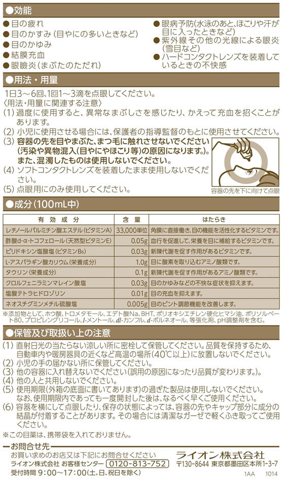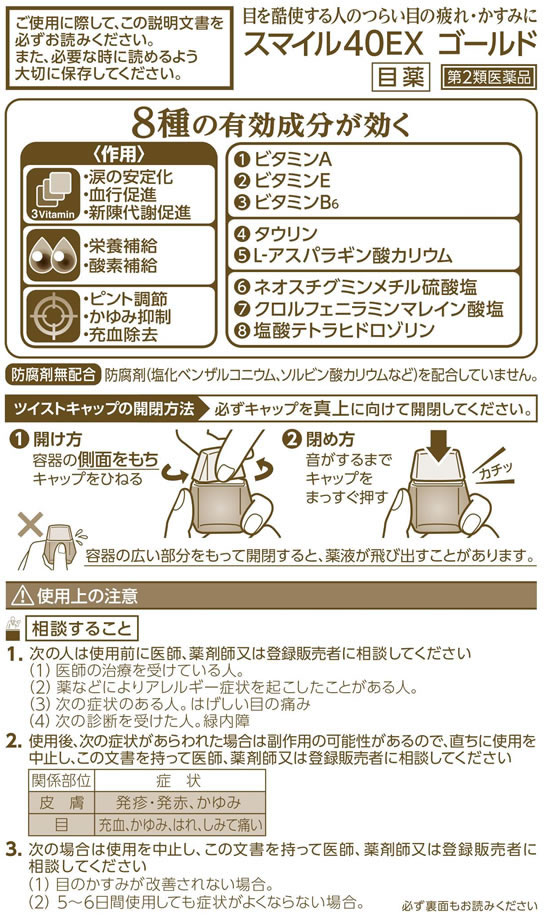 活用しよう「医療費控除制度」! 一部の医薬品の場合、ご購入された金額がご自分と扶養家族の分も含めて年間で「合計10万円(税込)」を超えた場合、確定申告をすることにより、所得税が一部還付されたり、翌年の住民税が減額される制度があります。 対象品の情報など詳しくは厚生労働省か、最寄りの関係機関へお問い合わせください(※控除対象外の医薬品もございます)。 商品名:【第2類医薬品】 スマイル40 EX ゴールド 13ml 内容量:13ml JANコード:4903301017035 発売元、製造元、輸入元又は販売元:ライオン(株) 原産国:日本 区分:第2類医薬品 □□□ 商品説明 □□□ 目を酷使する人のつらい目の疲れ・かすみに効く目薬です。トリプルビタミン処方で血行促進・新陳代謝促進作用で目の疲れ・かすみに効果を発揮。ダブルアミノ酸処方で、2種の栄養成分が疲れた瞳に直接効きます。防腐剤(塩化ベンザルコニウム、ソルビン酸カリウムなど)を配合していません。じんわり冷たい清涼感。医薬品。 □□□ 使用上の注意 □□□ ●相談すること 1.次の人は使用前に医師又は薬剤師に相談してください (1)医師の治療を受けている人。 (2)薬などによりアレルギー症状を起こしたことがある人。 (3)次の症状のある人。 はげしい目の痛み (4)次の診断を受けた人。 緑内障 2.使用後、次の症状があらわれた場合は副作用の可能性があるので、直ちに使用を中止し、この文書を持って医師、薬剤師又は登録販売者に相談してください。 |関係部位|症状| |皮膚|発疹・発火、かゆみ| |目|充血、かゆみ、はれ、しみて痛い| 3.次の場合は使用を中止し、この文書を持って医師、薬剤師又は登録販売者に相談してください。 (1)目のかすみが改善されない場合。(2)5-6日間使用しても症状がよくならない場合。 □□□ 効能・効果 □□□ ●目の疲れ ●目のかすみ(目やにの多いときなど) ●目のかゆみ ●結膜充血 ●眼瞼炎(まぶたのただれ) ●眼病予防(水泳のあと、ほこりや汗が目に入ったときなど) ●紫外線その他の光線による眼炎(雪目など) ●ハードコンタクトレンズを装着しているときの不快感 □□□ 用法・用量 □□□ 1日3-6回、1回1-3滴を点眼してください。 (用法・用量に関連する注意) (1)過度に使用すると、異常なまぶしさを感じたり、かえって充血を招くことがあります。 (2)小児に使用させる場合には、保護者の指導監督のもとに使用させてください。 (3)容器の先を目やまぶた、まつ毛に触れさせないでください(汚染や異物混入(目やにやほこリ等)の原因になります。)。また、混濁したものは使用しないでください。 (4)ソフトコンタクトレンズを装着したまま使用しないでください。 (5)点眼用にのみ使用してください。 ・容器の先を下に向けて点眼 【ツイストキャップの開閉方法】:必ずキャップを真上に向けて開閉してください。 (1)開け方:容器の側面をもちキャップをひねる。 (2)閉め方:音がするまでキャップをまっすぐ押す。 ※容器の広い部分をもって開閉すると、薬液が飛び出すことがあります。 □□□ 成分・分量 □□□ 100ml中 |有効成分 |含量 |はたらき | |レチノールパルミチン酸エステル(ビタミンA) |33000単位 |角膜に直接働き、目の機能を活性化するビタミンです。 | |酢酸d-α-トコフェロール(天然型ビタミンE) |0.05g |血行を促進して、栄養を目に補給するビタミンです。 | |ピリドキシン塩酸塩(ビタミンB6) |0.03g |新陳代謝を促す作用があるビタミンです。 | |L-アスパラギン酸カリウム(栄養成分) |1.0g |目に酸素を取り込むアミノ酸です。 | |タウリン(栄養成分) |0.1g |新陳代謝を促す作用があるアミノ酸です。 | |クロルフェニラミンマレイン酸塩 |0.03g |目のかゆみなどの不快な症状を抑えます。 | |塩酸テトラヒドロゾリン |0.01g |目の充血を抑えます。 | |ネオスチグミンメチル硫酸塩 |0.005g |目のピント調節機能を改善します。 | ※添加物として、ホウ酸、トロメタモール、エデト酸Na、BHT、ポリオキシエチレン硬化ヒマシ油、ポリソルベート80、プロピレングリコール、l-メントール、dl-カンフル、等張化剤、pH調整剤を含む。 □□□ 保管および取扱い上の注意 □□□ (1)直射日光の当たらない涼しい所に密栓して保管してください。品質を保持するため、自動車内や暖房器具の近くなど高温の場所(40度以上)に放置しないでください。 (2)小児の手の届かない所に保管してください。 (3)他の容器に入れ替えないでください。(誤用の原因になったり品質が変わります。) (4)他の人と共用しないでください。 (5)使用期限(外箱の底面に書いてあります)の過ぎた製品は使用しないでください。なお、使用期限内であっても一度開封した後は、なるべく早くご使用ください。 (6)容器を横にして点眼したり、保存の状態によっては、容器の先やキャップ部分に成分の結晶が付着することがあります。その場合には清潔なガーゼ等で軽くふき取ってご使用ください。 ※この目薬は、携帯袋を入れておりません。 □□□ お問い合わせ先 □□□ お買い求めのお店又