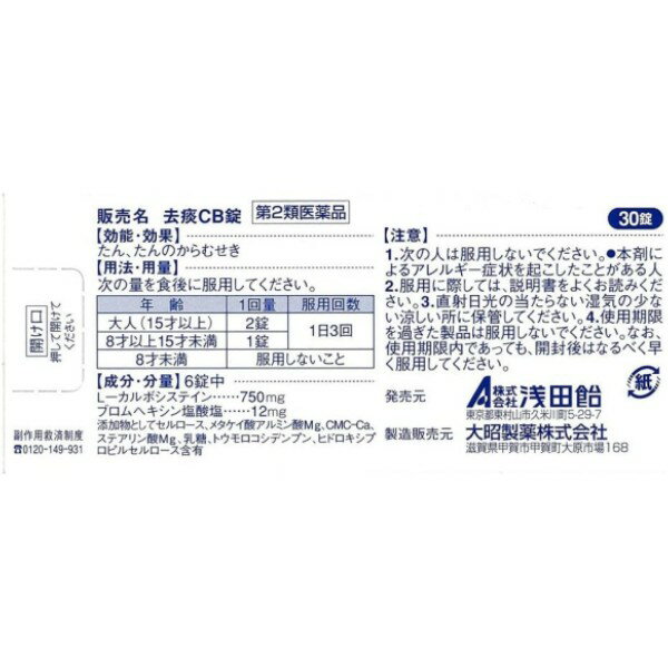 商品紹介 なかなか切れない粘稠な“たん"は安眠や安静が妨げられイライラするものです。 また、のどにからまるたんやたんを伴うせきは、病中の体力を消耗させ、余病を 併発することもあり、早めに処置したいものです。去痰CB錠は2つの去たん成 分L-カルボシステインとブロムへキシン塩酸塩を配合したお薬で、たんとたん のからむせきに効果を発揮します。 医薬品の販売について ●使用上の注意 ■■してはいけないこと■■ [守らないと現在の症状が悪化したり、副作用が起こりやすくなります。] 1.次の人は服用しないでください。 本剤又は本剤の成分によりアレルギー症状を起こしたことがある人 2.本剤を服用している間は、次のいずれの医薬品も使用しないでください。 他の鎮咳去痰薬、かぜ薬 ■■相談すること■■ 1.次の人は服用前に医師、薬剤師又は登録販売者にご相談ください。 (1)医師の治療を受けている人 (2)妊婦又は妊娠していると思われる人 (3)高齢者 (4)薬などによりアレルギー症状を起こしたことがある人 (5)高熱のある人 (6)心臓病、肝臓病の診断を受けた人 2.服用後、次の症状があらわれた場合は副作用の可能性がありますので、直ちに服 用を中止し、この説明書を持って医師、薬剤師又は登録販売者にご相談ください。 [関係部位] [症 状] 皮膚 発疹・発赤、かゆみ 消化器 吐き気・嘔吐、食欲不振、腹痛 精神神経系 頭痛 その他 血たん まれに下記の重篤な症状が起こることがあります。その場合は直ちに医師の診療を受 けてください。 [症状の名称] [症 状] ショック(アナフィラキシー) 服用後すぐに、皮膚のかゆみ、じんましん、 声のかすれ、くしゃみ、のどのかゆみ、息 苦しさ、動悸、意識の混濁等があらわれる。 皮膚粘膜眼症候群 高熱、目の充血、目やに、唇のただれ、の (スティーブンス・ジョンソン症候群)、どの痛み、皮膚の広範囲の発疹・発赤等が 中毒性表皮壊死融解症 持続したり、急激に悪化する。 肝機能障害 発熱、かゆみ、発疹、黄疸(皮膚や白目が 黄色くなる)、褐色尿、全身のだるさ、食 欲不振等があらわれる。 3.服用後、次の症状があらわれることがありますので、このような症状の持続又は 増強が見られた場合には、服用を中止し、この説明書を持って医師、薬剤師又は 登録販売者にご相談ください。 下痢、口のかわき 4.3~4日間服用しても症状がよくならない場合は服用を中止し、この説明書を持 って医師、薬剤師又は登録販売者にご相談ください。 ●効能・効果 たん、たんのからむせき ●用法・用量 次の量を食後に服用してください。 [年 齢] [1回量] [服用回数] 大人(15才以上) 2錠 1日3回 8才以上15才未満 1錠 1日3回 8才未満 服用しないこと 本剤の服用により、一時的にたんの量が増えることがありますが、ご心配ありません。 <用法・用量に関連する注意> ・定められた用法、用量を厳守してください。 ・小児に服用させる場合には、保護者の指導監督のもとに服用させてください。 ・錠剤の取り出し方 錠剤の入っているPTPシートの凸部を指先で強く押して裏面のアルミ箔を破り、 取り出して服用してください。 (誤ってそのまま飲み込んだりすると食道粘膜に突き刺さる等思わぬ事故につなが ります。) ●成分・分量 6錠中 [成 分] [分 量] [作 用] L-カルボシステイン 750mg 気道粘膜を正常化し、たんの流動性を高 め、出しやすくします。 ブロムヘキシン塩酸塩 12mg 気道粘液の分泌を亢進させ、のどにから んだたんをうすめ、出しやすくします。 添加物として、セルロース、メタケイ酸アルミン酸Mg、CMC-Ca、 ステアリン酸Mg、乳糖、トウモロコシデンプン、 ヒドロキシプロピルセルロース含有 ●保管及び取扱いの注意 (1)直射日光の当たらない湿気の少ない涼しい所に保管してください。 (2)小児の手の届かない所に保管してください。 (3)他の容器に入れ替えないでください(誤用の原因になったり品質が 変化します)。 (4)使用期限を過ぎた製品は服用しないでください。 ●お問い合わせ先 本剤について、何かお気付きの点がございましたら、お買い求めのお店又は下記まで ご連絡頂きますようお願い申し上げます。 株式会社浅田飴 お客様相談室 東京都東村山市久米川町5-29-7 03-3953-4044(ダイヤルイン) 9:00~17:00(土、日、祝日を除く) 製造販売元 大昭製薬株式会社 滋賀県甲賀市甲賀町大原市場168