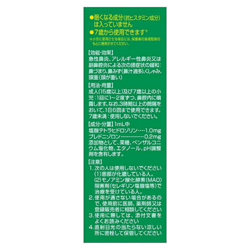 商品説明文 コールタイジン点鼻液aは,アレルギー性鼻炎又は副鼻腔炎による鼻づまり,鼻みずなど不快な鼻炎症状を改善する鼻炎用点鼻薬です。 使用上の注意 ■してはいけないこと (守らないと現在の症状が悪化したり,副作用が起こりやすくなります) 1.次の人は服用しないで下さい。 (1)患部が化膿している人。 (2)モノアミン酸化酵素(MAO)阻害剤(セレギリン塩酸塩等)で治療を受けている人。 2.長期連用しないでください ■相談すること 1.次の人は服用前に医師,歯科医師又は薬剤師に相談して下さい。 (1)医師の治療を受けている人 (2)妊婦又は妊娠していると思われる人 (3)薬などによりアレルギー症状を起こしたことがある人。 (4)次の診断を受けた人。 高血圧,心臓病,糖尿病,甲状腺機能障害,緑内障 (5)高齢者。 2.使用後,次の症状があらわれた場合は副作用の可能性があるので,直ちに使用を中止し,この文書を持って医師,薬剤師又は登録販売者に相談してください [関係部位:症状] 皮膚:発疹・発赤,かゆみ 精神神経系:眠気,頭痛,めまい,ふるえ,不眠,脱力感 鼻:はれ,刺激感,熱感,乾燥感,鼻みず その他:血圧上昇,動悸,不整脈,口の渇き,味覚異常 3.3日間位使用しても症状がよくならない場合は使用を中止し,この文書を持って医師,薬剤師又は登録販売者に相談してください 有効成分・分量 1ml中 塩酸テトラヒドロゾリン 1.0mg、プレドニゾロン0.2mg 添加物 果糖,ベンザルコニウム塩化物,エタノール,pH調整剤 効能・効果 急性鼻炎,アレルギー性鼻炎又は副鼻腔炎による次の諸症状の緩和:鼻づまり,鼻みず(鼻汁過多),くしゃみ,頭重(頭が重い) 用法・用量 次の量を,水又はお湯で服用して下さい。 [年齢:1回量:1日使用回数] 成人(15歳以上):1~2度ずつ鼻腔内に噴霧します。:3時間以上の間隔をおいて,6回まで使用できます。 7歳以上15歳未満:1~2度ずつ鼻腔内に噴霧します。:3時間以上の間隔をおいて,6回まで使用できます。 7歳未満:使用しないでください。 保管及び取り扱い上の注意 (1)直射日光の当たらない涼しい所に密栓して保管してください。 (2)小児の手の届かない所に保管してください。 (3)他の容器に入れ替えないでください(誤用の原因になったり品質が変わります。)。 (4)他の人と共用しないでください。 (5)使用期限(外箱及び容器に記載)をすぎた製品は使用しないでください。 問い合わせ先 消費者相談窓口 会社名:ジョンソン・エンド・ジョンソン株式会社:お客様相談室 電話:0120-834389 受付時間:9:00~17:00(土,日,祝日を除く)