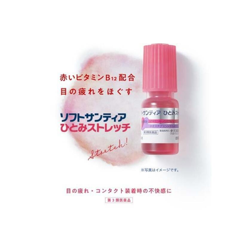 商品説明 コンタクトレンズ装着時の不快感に 目薬 目が重い・コンタクトがゴロゴロする・・・コンタクトをしている目は疲れがちです。 ソフトサンティア ひとみストレッチは、こりかたまった目のピント調節筋(毛様体筋)をほぐす成分*1を二種類、最大濃度配合*2しました。疲れた目の組織代謝を促進するビタミンB6も最大濃度配合*2し、使い続けた目の疲れを改善します。 *1 ネオスチグミンメチル硫酸塩・ビタミンB12 *2 一般用眼科用薬製造販売承認基準の最大濃度(承認基準とは厚生労働省が承認事務の効率化を図るために定めた医薬品の範囲のこと) ソフトサンティア ひとみストレッチはカラーコンタクトレンズを除くすべてのコンタクトレンズ装着中に使えます。 ソフト O2 ハード 使い捨て(ディスポーザブル) コンタクトレンズを装着していない方もご使用いただけます。 ※ソフトコンタクトレンズを装着したままでは使用できない目薬もありますので、外箱や添付文書をよく確認しましょう。 使用上の注意 相談すること 1.次の人は使用前に医師、薬剤師または登録販売者にご相談ください。 (1)医師の治療を受けている人 (2)薬などによりアレルギー症状を起こしたことがある人 (3)次の症状のある人 はげしい目の痛み (4)次の診断を受けた人 緑内障 2.使用後、次の症状があらわれた場合は副作用の可能性があるので、直ちに使用を中止し、この文書を持って医師、薬剤師または登録販売者にご相談ください。 関係部位・・・症状 皮ふ・・・発疹・発赤、かゆみ 目・・・充血、かゆみ、はれ、しみて痛い 3.次の場合は使用を中止し、この文書を持って医師、薬剤師または登録販売者にご相談ください。 (1)目のかすみが改善されない場合 (2)2週間くらい使用しても症状がよくならない場合 成分・分量 成分・・・分量・・・作用 ビタミンB12(シアノコバラミン)・・・0.02%・・・毛様体筋の働きを活発にし、目の疲れを改善します。 ネオスチグミンメチル硫酸塩・・・0.005%・・・ピント調節機能改善作用により、目の疲れなどを改善します。 ビタミンB6(ピリドキシン塩酸塩)・・・0.1%・・・目の組織代謝を活発にします。 添加物として、エデト酸ナトリウム水和物、ホウ酸、ポビドン、等張化剤、pH調節剤を含有します。 効能・効果 目の疲れ、ソフトコンタクトレンズまたはハードコンタクトレンズを装着しているときの不快感、眼病予防(水泳のあと、ほこりや汗が目に入ったときなど)、目のかすみ(目やにの多いときなど) 用法・用量 1回1~3滴、1日5~6回点眼してください。 用法・用量に関する注意 ●次の注意事項をお守りください。 (1)小児に使用させる場合には、保護者の指導監督のもとに使用させてください。 (2)容器の先を、目やまぶた、まつ毛に触れさせないでください(目やにや雑菌などの混入のため、薬液が汚染または混濁することがあります)。また、混濁したものは使用しないでください。 (3)点眼用にのみ使用してください。 (4)カラーコンタクトレンズの装着時は使用しないでください。 保管及び取扱い上の注意 (1)使用するまでは、キャップをねじ込まないでください。 (2)直射日光の当たらない涼しい所に密栓して保管してください。製品の品質を保持するため、自動車の中や暖房器具の近くなど高温となる場所に放置しないでください。また、高温となる場所に放置したものは、容器が変形して薬液が漏れたり薬液の品質が劣化しているおそれがありますので、使用しないでください。 (3)小児の手の届かない所に保管してください。 (4)他の容器に入れ替えないでください。 (誤用の原因になったり品質が変わることがあります。) (5)他の人と共用しないでください。 (6)使用期限をすぎた製品は使用しないでください。また、使用期限内であっても、開栓後は約1ヶ月を目安に使用してください。 (7)保存の状態によっては、成分の結晶が容器の点眼口周囲やキャップの内側に赤くつくことがあります。その場合には清潔なガーゼで軽くふき取って使用してください。 (8)本剤の赤い色はビタミンB12(シアノコバラミン)の色です。点眼中に薬液がこぼれてシャツなどが着色した場合は、すぐに水洗いしてください。 その他の記載事項 開栓方法 肩口にとどくまでまわすと・・・→点眼口にアナがあきます。 〔自然環境に配慮し、携帯袋は添付しておりません。ご理解の程お願い申し上げます。〕 製品に関するお問い合わせ先 商品の内容についてのお問い合わせは、お買い求めのお店、または下記にお願い申し上げます。 参天製薬株式会社「お客様相談室」 電話番号・・・0120-127-023 電話受付時間・・・9:00~17:00(土・日・祝日を除く) 添付文書版番号・・・03 製造販売元住所等 参天製薬株式会社 大阪市北区大深町4-20 商品区分 第3類医薬品
