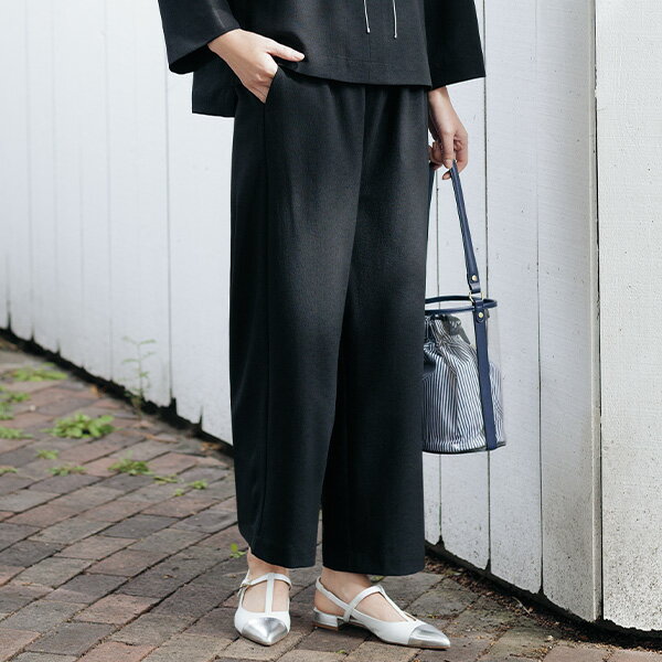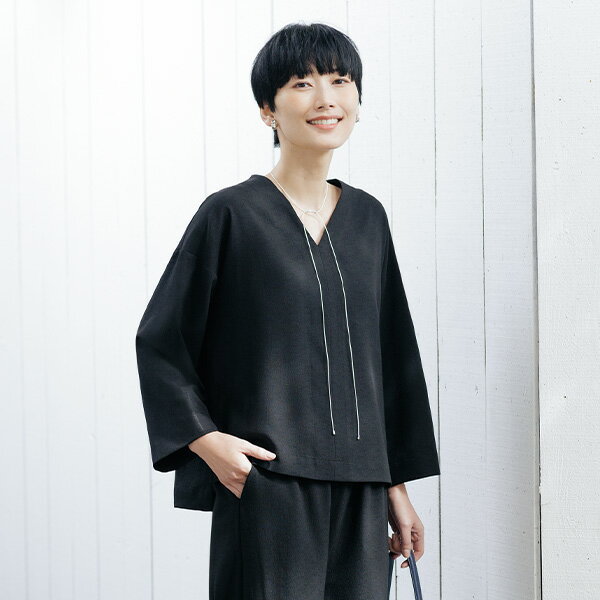 凛とスマートなふりしてゆったり涼やかな着心地。 顔まわりをすっきり見せるVネックや太めの袖幅、体型を拾わないセミワイドシルエットなど、スタイルアップの技を込めたセットアップは、シックながらモードな着映え感。 シャリッと涼やかな肌触りで、単品でも活躍させて。 □2点セット [M]ブラウス/バスト104(79〜87)、裄丈68、前身丈57、後ろ身丈62、パンツ/適応ウエスト64〜70、ヒップ102(87〜95)、総丈96、股下60、裾巾25 [L]ブラウス/バスト110(86〜94)、裄丈69、前身丈58、後ろ身丈63、パンツ/適応ウエスト69〜77、ヒップ107(92〜100)、総丈97、股下60、裾巾26 [LL]ブラウス/バスト116(93〜101)、裄丈70、前身丈59、後ろ身丈64、パンツ/適応ウエスト77〜85、ヒップ112(97〜105)、総丈98、股下60、裾巾27 ●素材/ポリエステル100% ●〈ブラウス〉両脇スリット(約7cm)、〈パンツ〉ウエスト総ゴム入り、左右ポケット ●中国製 ※アクセサリー・バッグ・シューズは参考商品です。 ※手洗いOK ※洗濯機OK ※ドライクリーニング ※衣料品のサイズ( )付き数字は、ヌード寸法です。サイズについて詳しくはコチラ≫ 京都通販は昭和49年にカタログ通販からスタートしたファッション雑貨の専門店です。 40代 50代 60代 70代 80代と幅広い世代に大人可愛い、おしゃれをご提案! レディース婦人服 ワンピース チュニック アンサンブル ベスト ニット パンツ ボトム プルオーバー シャツ インナー ブラウス ジャンパースカート ブラックフォーマル スーツ バッグ かばん リュック 鞄 ショルダーバッグ ハンドバッグ スマホポシェットなど 多数のアイテムで コーディネートをお楽しみいただけます。 百貨店通販掲載商品や大きいサイズも豊富にご用意。 お出かけや旅行、結婚 記念日 誕生日 敬老の日 母の日などのお祝い、ギフトやプレゼントに! おばあちゃん シニア シルバー世代にもご好評いただいています。 祖母 義母 還暦 古希 喜寿 米寿 四十代 五十代 六十代 七十代 八十代 介護 老人ホーム ブランド きれいめ こなれ モード otonacawaiifuku