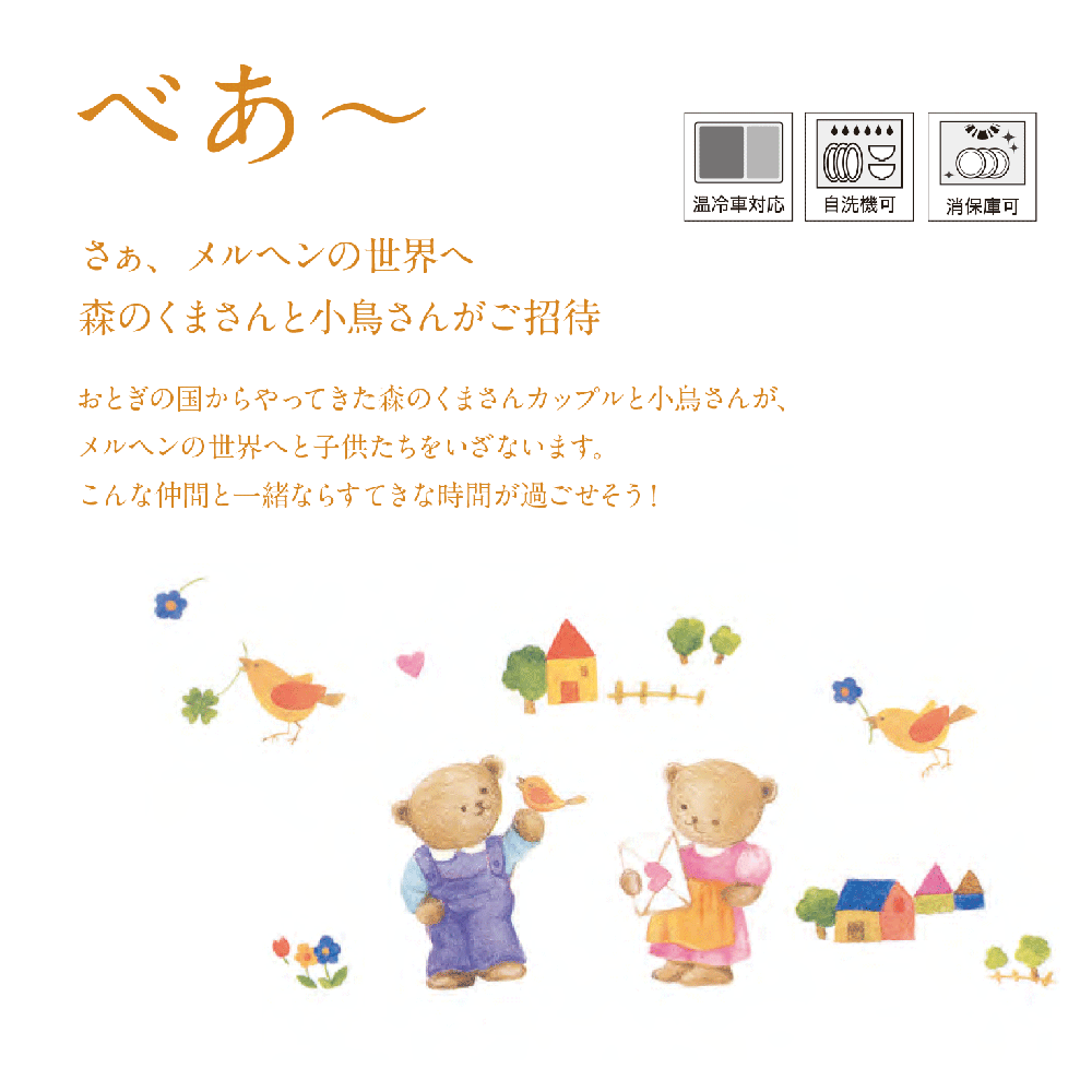 べあ〜 スプーン べあ〜[3010-BA]の解説 さあ、メルヘンの世界へ。森のくまさんと小鳥さんがご招待。おとぎの国からやってきた森のくまさんカップルと小鳥さんが、メルヘンの世界へと子供たちをいざないます。こんな仲間と一緒ならすてきな時間が過ごせそう! べあ〜 スプーン[3010-BA]の詳細 メーカー信濃化学工業株式会社(shinca) 商品名スプーン 柄名・シリーズ名べあ〜・べあ〜 品番3010-BA 同サイズ柄違い一覧「SINA-3010」 サイズ全長138×幅30mm 重量22g 材質メラミン/ステン 耐熱温度120℃ 食器洗浄機使用可 食器消毒保管庫使用可(85℃、20-30分) カラー・イメージ白地 ホワイト くま クマ かわいい レトロ ■メーカー希望小売価格はメーカーカタログに基づいて掲載しています