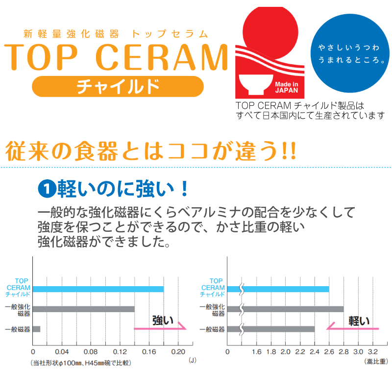 !!メーカー取り寄せ品のため発送まで約2-7営業日(土日祝除く)かかります。予めご了承の上ご注文をお願いいたします。また、商品が欠品中の場合もございますのでお急ぎの場合はご注文前に在庫のご確認をお願いいたします。 強化磁器 スタック深皿 トップセラム[TCS-145]の解説 「かるい」「つよい」「キレイ」お子様の手や口が触れる食器を、よりやさしく、軽くしたい。産学共同研究で開発された「微粒子石英の結晶化制御技術」と「還元焼成法」を用い、「TOP CERAM チャイルド」シリーズを完成させました。軽くて強いだけでなく、手に取って触れたくなる、美しいアイテムです。●一般的な強化磁器にくらべアルミナの配合を少なくして強度を保つことができるので、かさ比重の軽い強化磁器食器ができました。●一般的な強化磁器にくらべアルミナの配合が少なく熱伝導率が低いため、冷めにくく持ちやすい。●一般的な強化磁器にくらべアルミナの配合が少ないため、透光性か高く白さが美しい強化磁器食器ができました。また通常より細かく均質化した釉薬を使うことで、表面の凹凸が少ない状態になり、汚れがついても落ちやすくなりました。●全ての形状の糸底に水切り加工を施すことで、食器洗浄機を使用しても水がたまらず乾燥が早くなりました。 強化磁器 スタック深皿 トップセラム[TCS-145]の詳細 メーカーキッズメイト(朝日化工) 掲載カタログ保育園・幼稚園給食用食器シリーズ キッズメイト 商品名スタック深皿 シリーズ名(柄名)トップセラムファインホワイト|シロクマとペンギン|ハッピークローバー|ファインピンク 型番TCS-145FNW/TCS-145SKP/TCS-145HPC/TCS-145FNP 同サイズ柄違い「kids-TCS-145」 サイズ直径146×高さ39mm/満水容量:400cc 重量220g 材質強化磁器材質一覧 食器洗浄機使用可 食器消毒保管庫使用可 電子レンジ使用可 ■メーカー希望小売価格はメーカーカタログに基づいて掲載しています {sd16 {sh40 {kj