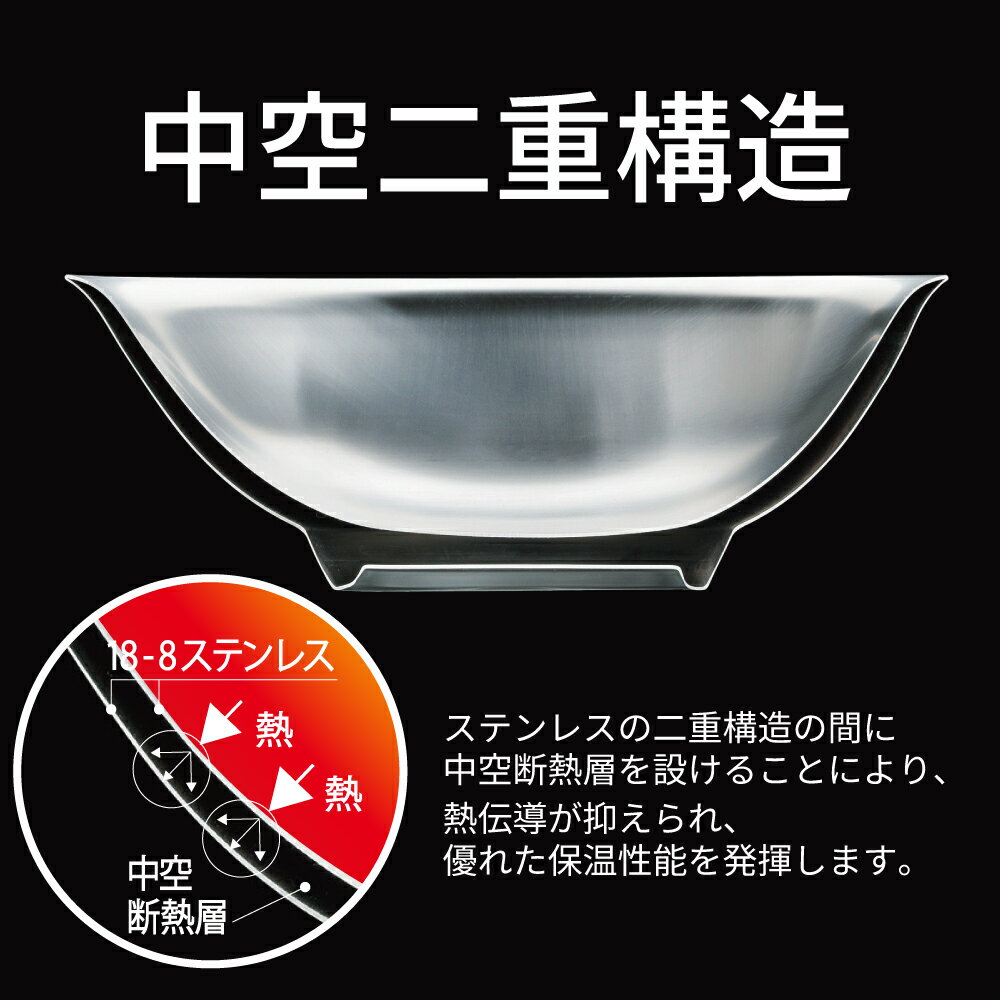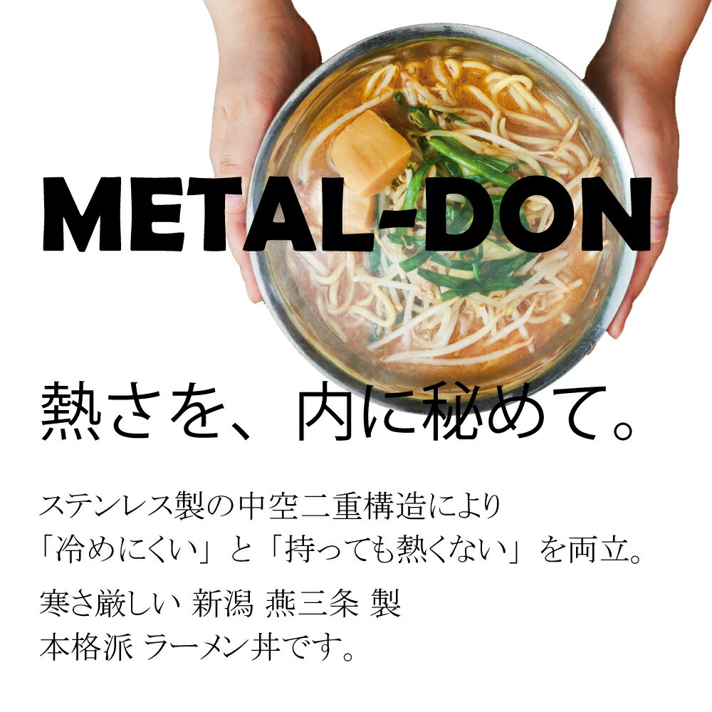 【ステンレスミラー磨き仕様】【ステンレスオールつや消磨仕様】【塗装仕様黒】【塗装仕様赤】【塗装仕様黄】【塗装仕様白】【塗装仕様青磁】●メタル丼の特徴● 温かい料理を温かいままに、冷たい料理は冷たいままに。中空2重構造の「メタル丼」が、そんな「当たり前」を実現します。 [スープが冷めにくい] …中空2重構造を採用した、中身が冷めにくい保温食器です。※中空2重構造とは:ステンレスの2重構造の間に、中空断熱層を設けることにより、スープの熱伝導が抑えられ、優れた保温性能を発揮します。 [触っても熱くなりにくい] …中身の温度が直接手に伝わりにくい優れもの! [割れない] …丈夫な18-8ステンレス製。 ●made in 燕三条● 金物の国内最大の生産地、燕三条。隣接する燕市と三条市は、古くから金属加工品の製造技術が高く、特に燕市は洋食器、三条市は刃物・金物の産地として有名でした。それは燕三条の職人達が、より良い製品をつくるために日々鍛錬を重ね、技術を磨いてきたからに他なりません。より良い製品づくりの心が今もなお息づいているからこそ、世界に誇れる製品を生み出していけるのです。 サイズ外径Φ300mm×H90mm 満水容量3300ccキングサイズ/取り分け・メガ盛り向け 材質18-8ステンレス(二重構造) 食器洗浄機使用可 食器乾燥機使用可 食器消毒保管庫使用可 電子レンジ使用不可 <塗装の剥がれ等にご注意>…本品の塗装品は、食品衛生法にも適合した塗料を使用して表面塗装を施しています。焼付処理を施しており、塗装部分は非常に剥がれにくくなっていますが、仕様状況によっては、フチ部分や底の接地面などの塗装が剥げてくる可能性があります。 !メーカー取り寄せ品のため発送まで約5-10日程度かかります。予めご了承の上ご注文をお願いいたします。また、商品が欠品中の場合もございますのでお急ぎの場合はご注文前に在庫のご確認をお願いいたします。 ■メーカー希望小売価格はメーカーカタログに基づいて掲載しています
