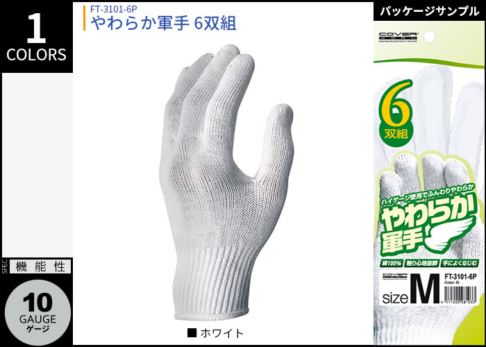 COVERWORK カヴァーワーク (FT-3101-6P) やわらか軍手 6双組 綿100% 軽作業 白 10G ハイゲージ【ワーク】 【作業用 手袋】