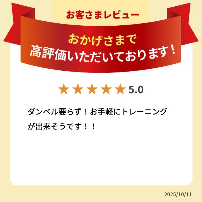【こちらは強度が選べる販売ページです】 ■レジスタンスバンドの最も優れた点は、『全身の筋トレに活用できる持ち運べるトレーニンググッズ』であること。 ■自宅やオフィス、旅行先でもトレーニングができる。 ■TVを見ながら、読書をしながら、『ながらトレーニング』で時間を有効活用。 ■選べる強度、自分に合ったトレーニングで徐々にステップアップできる ■平均30cm前後のループバンドと比べて104cmと長くトレーニングジム等で本格的なトレーニングに活用できる。 ■ゴムの張力を利用した負荷のかけ方なので、ケガのリスクも減り安心。 [選べる強度(強度順)] ■幅広い使用シーン 筋トレやダイエット以外でも、各チームの練習メニュー、教室、ジムやクラス、スタジオでのトレーニング方法として使用。 バスケットボールやバレーボール、サッカー、野球などの球技スポーツから水泳、陸上、格闘技、体操やヨガ・ピラティスなど屋外・屋内問わず様々なスポーツでの筋力トレーニング、瞬発力トレーニング、体幹トレーニングに用いることが出来ます。 ■幅広い層にご利用いただいています 男性・女性問わず筋トレ・エクササイズに用いられるほか、中学生や高校生、小学生の部活動、トレーナー・コーチの方はもちろん大学生、社会人チームなどの団体様にもご利用頂いています。 ■鍛えられる部位の一例 腹筋、胸筋、背筋、三角筋、腕筋、足筋など鍛えたい部位を集中的に手軽に鍛えられるのが魅力的なフィットネスチューブ。肩、胸、腕、首、背中などの筋力アップ。お腹、下半身、上半身、太もも、お尻のシェイプアップ。 脚(足)や二の腕など気になる箇所を重点的に鍛えられます。ゴムの張力で鍛えられるトレーニングチューブは、インナーマッスルや体幹を鍛えるのに最適です。 ■使用可能種目の一例 チューブプレス、チェストストレッチ、チューブローイング、バックストレッチ、ツイストアップ、サイドベント、チューブカール、フレンチプレス、サイドレイズ、スクワット、ヒップアブダクション、チューブレッグプレスなど付属品を使用する事でさらにトレーニングの幅が広がります。 ブレイキストは、『続ける人のため』のSHOPです。 どんなスタイルでも最高のパフォーマンスを。↑↑クーポン獲得はこちらのバナーをクリック↑↑ ↑↑クーポン獲得はこちらのバナーをクリック↑↑
